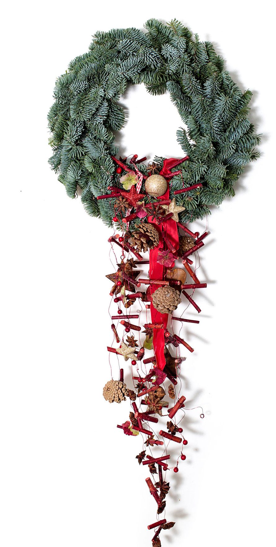 3 Asettele pajuriipukset kranssin alaosan ympäri siten, että niistä syntyy pisaranmuotoinen, alaspäin laskeutuva asetelma. Sido riipukset tiukasti kranssiin puolalangalla. Liimaa kuumaliimalla valitsemiasi koristeita suoraan havuihin kiinni. Kierrä osa koristeista langalla pajuriipukseen.