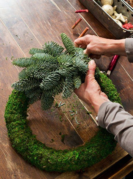 1 Osta valmis kranssipohja, joka on päällystetty toiselta puolelta sammaleella. Käytä kranssiin hopeakuusen, kuusen tai männyn oksia. Sido 2–3 lyhyttä, limittäin aseteltua oksanpätkää tiukasti kranssin päälle vihreällä metallisella puolalangalla. Pienet oksat on helpompi kiinnittää, kun ne on ensin sidottu kimpuiksi. Varo, ettei kranssista tule liian paksu. Kun olet tehnyt havupohjan valmiiksi, leikkaa puolalangan päät lyhyiksi.