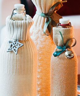 Kutista villapaita pesemällä. Käännä villapaita nurin ja sovita pulloa hihaan. Jos hiha on liian iso, pienennä se nuppineuloilla sopivan kokoiseksi. Hiha saa olla napakka, mutta pullon pitää mahtua vielä suuaukosta ulos. Leikkaa hiha muutama sentti pulloa pidemmäksi. Ota pullo pois, ompele koneella neulojen merkitsemää viivaa pitkin. Huolittele alareuna siksakki-ompeleella. Pujota pullo sukkaan. Pujottele vahvaa lankaa siksakki-ompeleen reunaan, ja kiristä reunaa sen verran, että se taipuu pullon alle. Lisää koristeet.