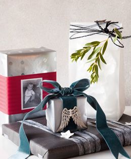 Kokoeroakin voi hyödyntää paketoinnissa. Pikkupaketin iso rusetti on samettinauhaa ja siivet joulukoriste. Hopeanvärisen paketin punainen vyöte on tapettia, ja sen päälle on liimattu valokopio vanhasta valokuvasta. Harmaa paketti on vyötetty vähän vinksin vonksin paltenauhalla, päällä huopatähtiä. Metallilanka ja eukalyptuksen oksa koristavat vaaleaa pakettia.