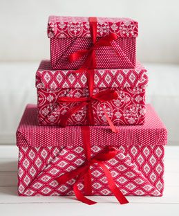 Kankaalla päällystetyt laatikot ovat kauniita katsella myös joulun jälkeen. Leikkaa laatikkoa varten kangaspala, joka on reunoiltaan noin 3 cm isompi kuin laatikko. Sivele pensselillä liimaa laatikon pohjaan ja reunoihin. Asettele laatikko kankaan keskelle ja taittele kangas kuten lahjapakettia paketoitaessa. Liimaa reunat laatikon sisälle. Päällystä kansi samalla tavalla.