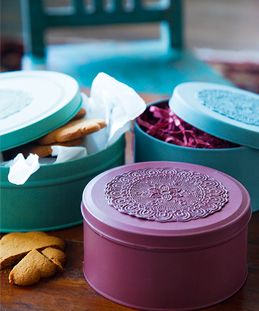 Hankaa peltipurkin pinta hiomapaperilla karheaksi. Puhdista lakkabensiinillä. Leikkaa pitsiliinasta kanteen sopiva pala ja liimaa se. Anna kuivua. Maalaa purkki 2–3 kertaa ja anna kuivua.