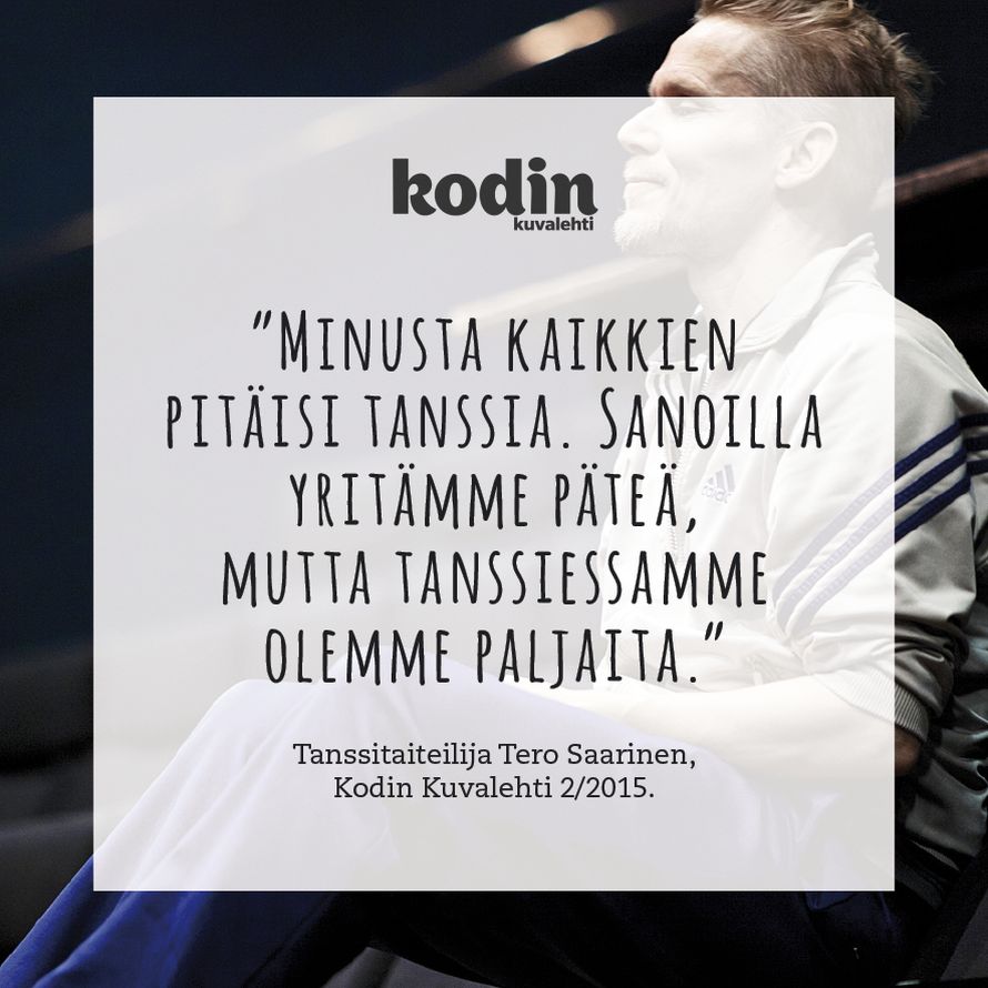Kaikkien pitäisi tanssia 15.3.2015 klo 15:00 "Minusta kaikkien pitäisi tanssia. Sanoilla yritämme päteä, mutta tanssiessamme olemme paljaita." Tanssitaiteilija Tero Saarinen, KK 2/15 Tilaa Kodin Kuvalehti Tilaa Lue digilehtenä