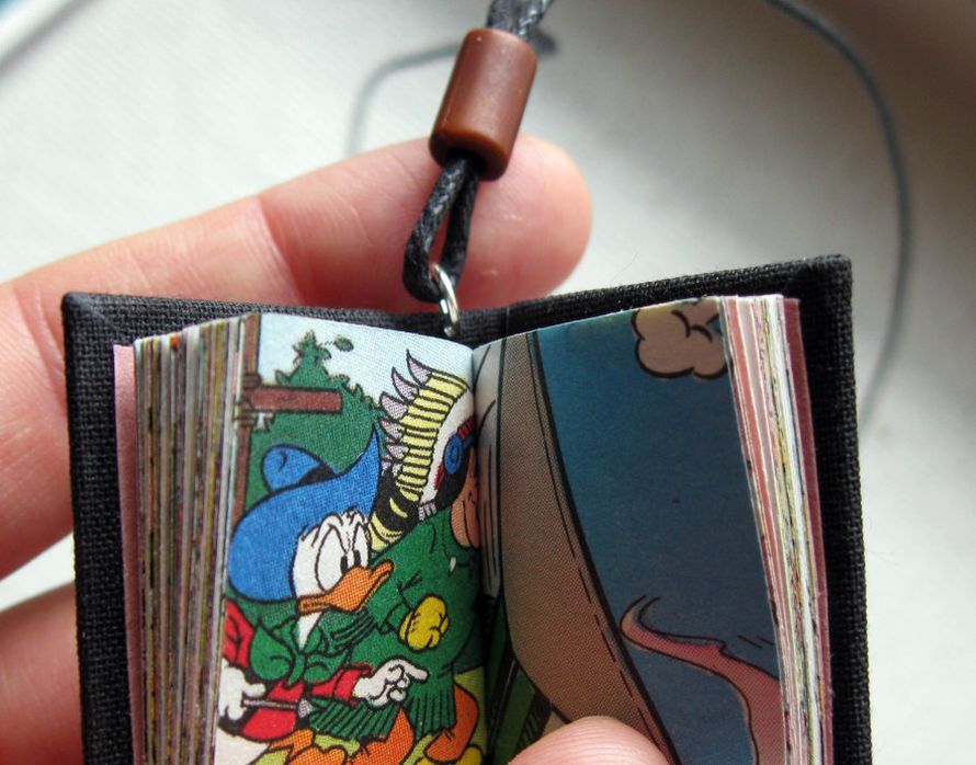 Ei-ihan-taskari, mutta ankkalinnalaisia sisältää melkein kaikki sivut. Keskiaukeamat ovat valkoiset, koska halvalla tehtyjen (tietysti!) taskukirjojen paperi ei ole kovin laadukasta ja aiemmissa tekeleissäni ne repesivät irti ompeleista haurauttaan.