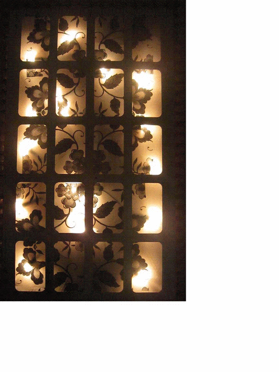 Tämä valaisin on valmistettu vanhan liesituulettimenen suodattimen ritilästä. Valoina toimiin vanhat osittain sammuneent jouluvalot ja "varjostin" on piirtoheitinkalvolle kopioitu laitasliina.