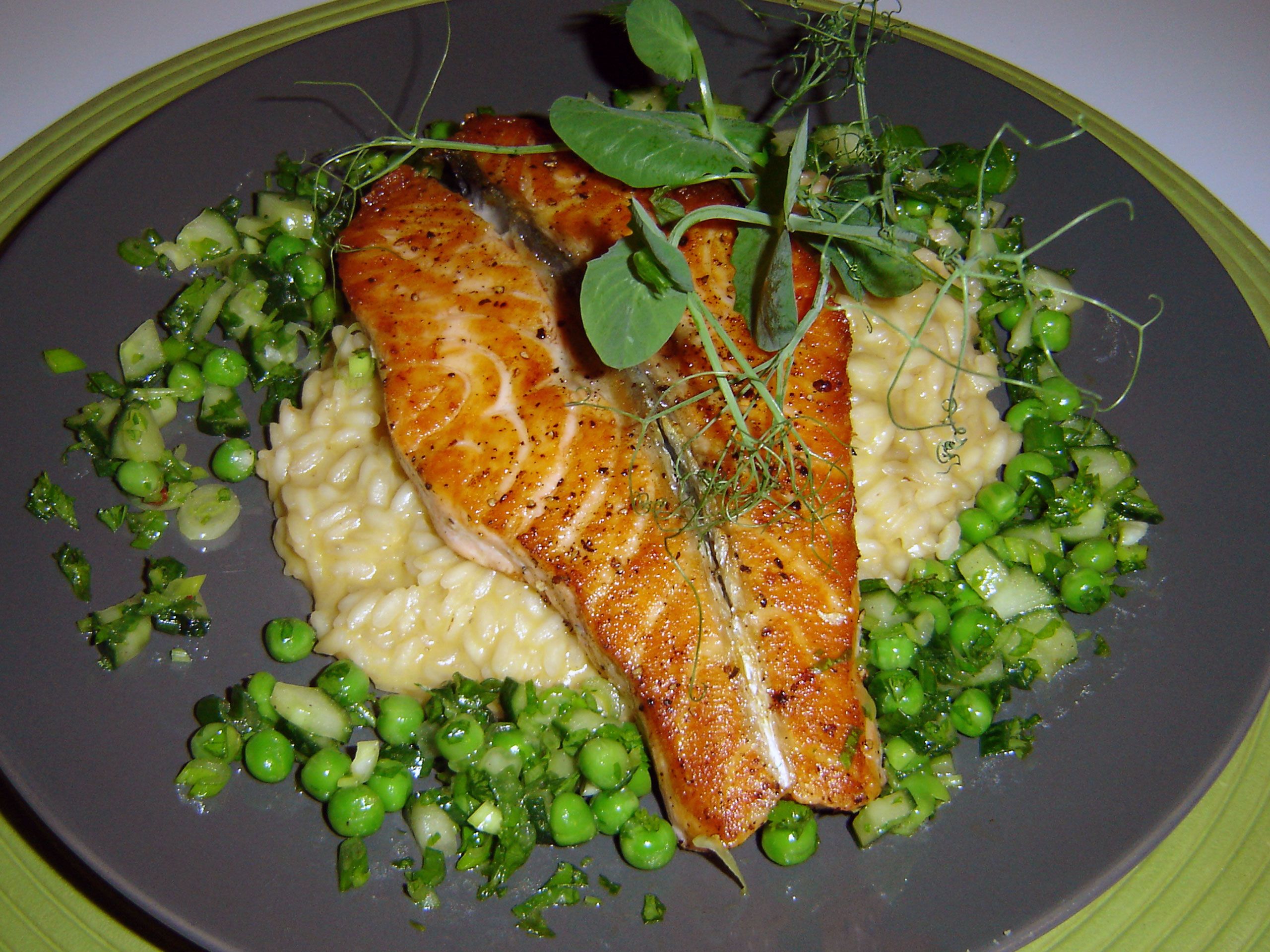 Tyrnirisottoa, paistettua lohta ja kurkku-hernesalsaa