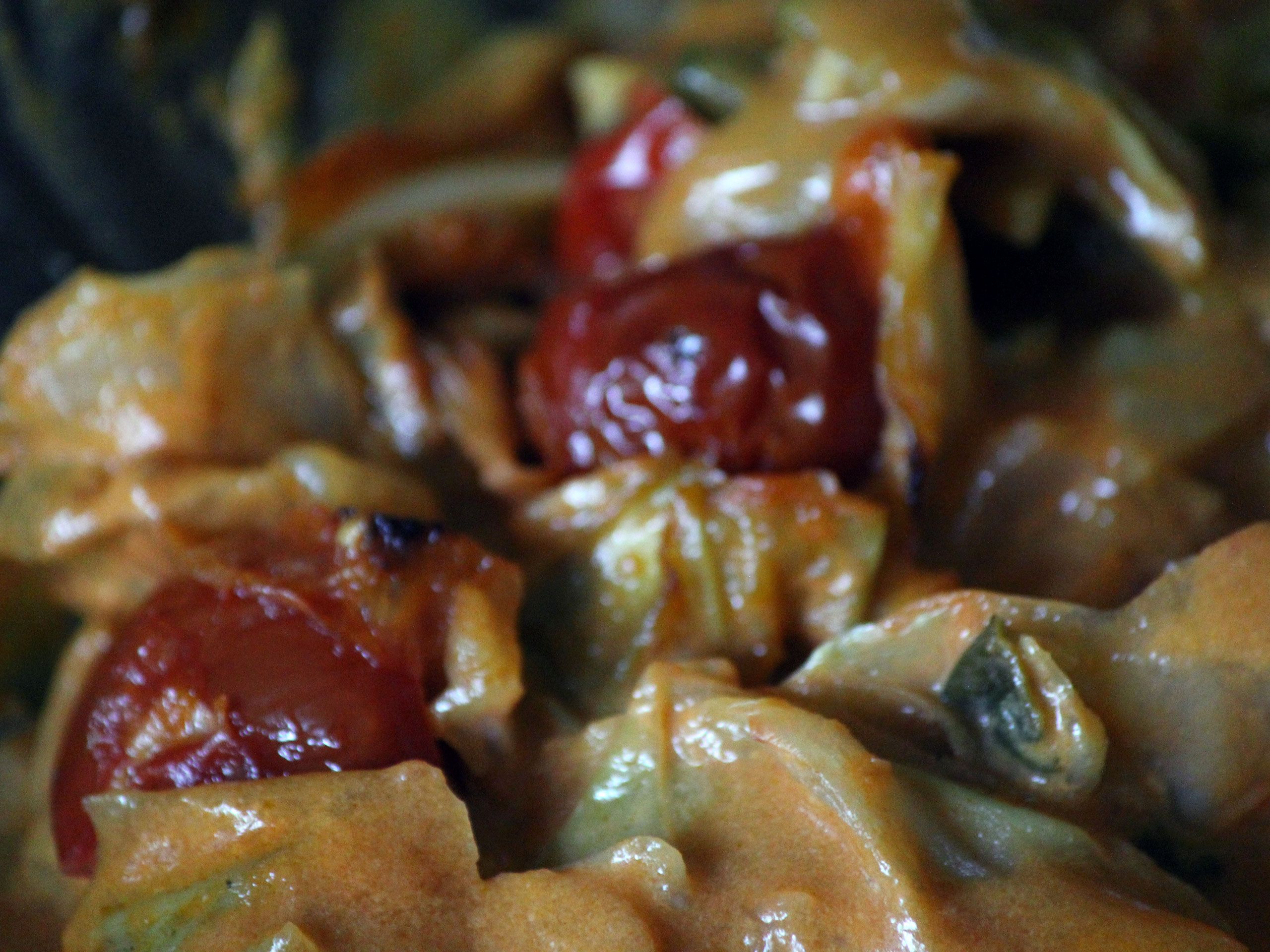 Vinkki! Jos haluat tehdä ruuan kokonaan pannulla, jatka kypsennystä pannulla puolisen tuntia ja ripottele juustoraaste pintaan. Kesällä kaali kypsentyy kätevästi ulkona paellapannussa.