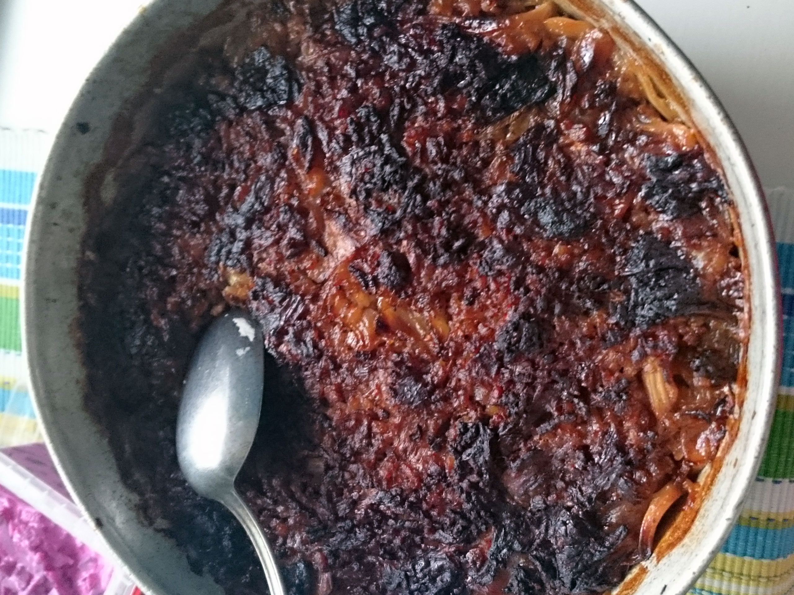 Paista uunin alatasolla ensin 225 asteessa, kunnes pinta ruskistuu. Laita sen jälkeen uunin alalämpö päälle 155 asteeseen ja anna laatikon hautua uunissa noin 2 tuntia. Jos pinta ruskistuu liikaa, peitä foliolla. Pinta saakin olla tumma, muttei palanut.