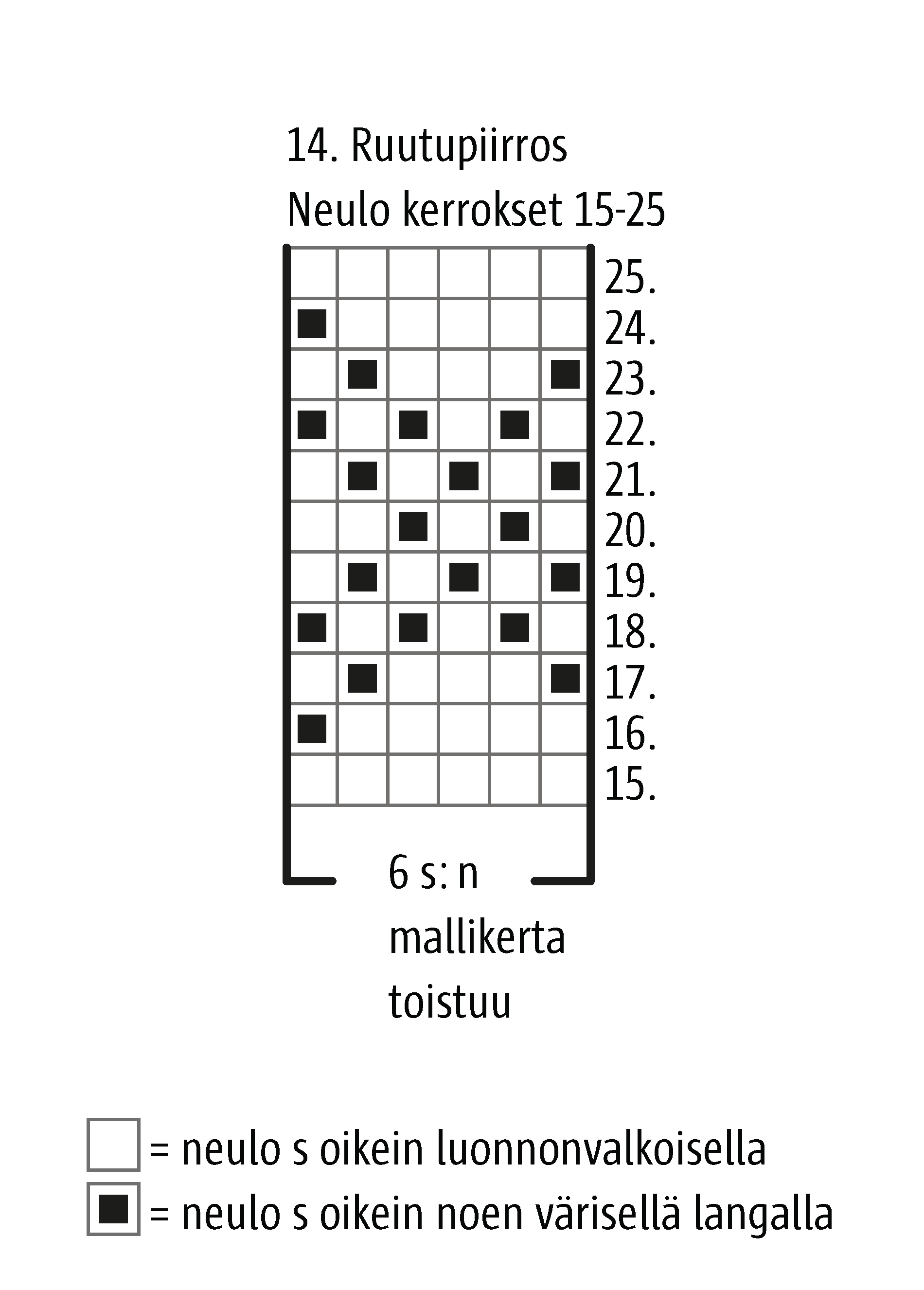 Jatka kirjoneuletta 14. ruutupiirroksen 15. krs:lta ja toista 6 s:n mallikerta 13 kertaa. Neulo krs:t 16–25.