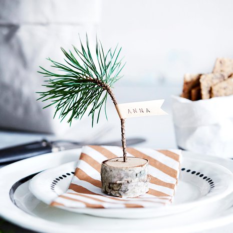 Kiedo lautasliina rullalle ja solmi se narulla. Pujota koristeeksi tuore viikuna, puolukanvarpu tai kanelitanko. Voit myös taitella lautasliinakoristeen rosmariinin oksasta.