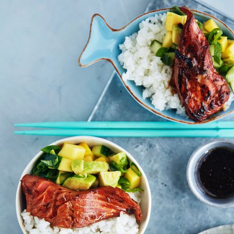 - Asettele täytteet wasabiraidan päälle. Kuvassa on käytetty soijassa marinoitua kuhaa.