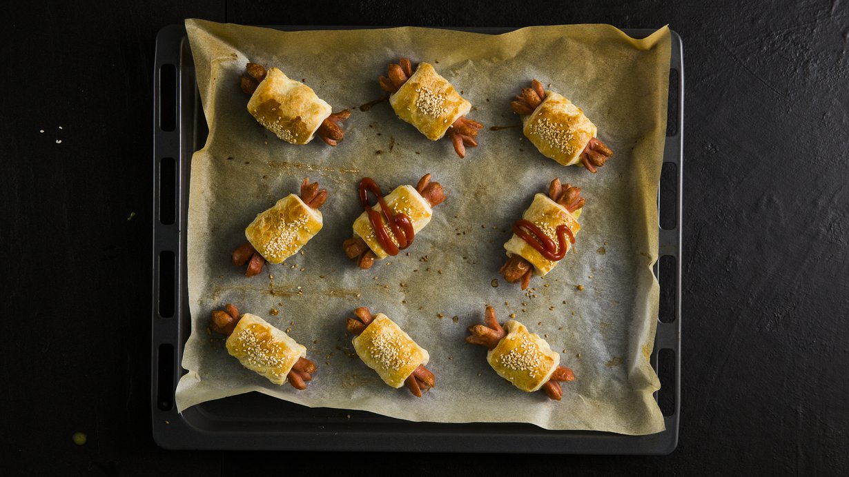 Paista uunin keskitasossa noin 15 minuuttia, kunnes nakkipiilojen pinta on kauniin kullanruskea.