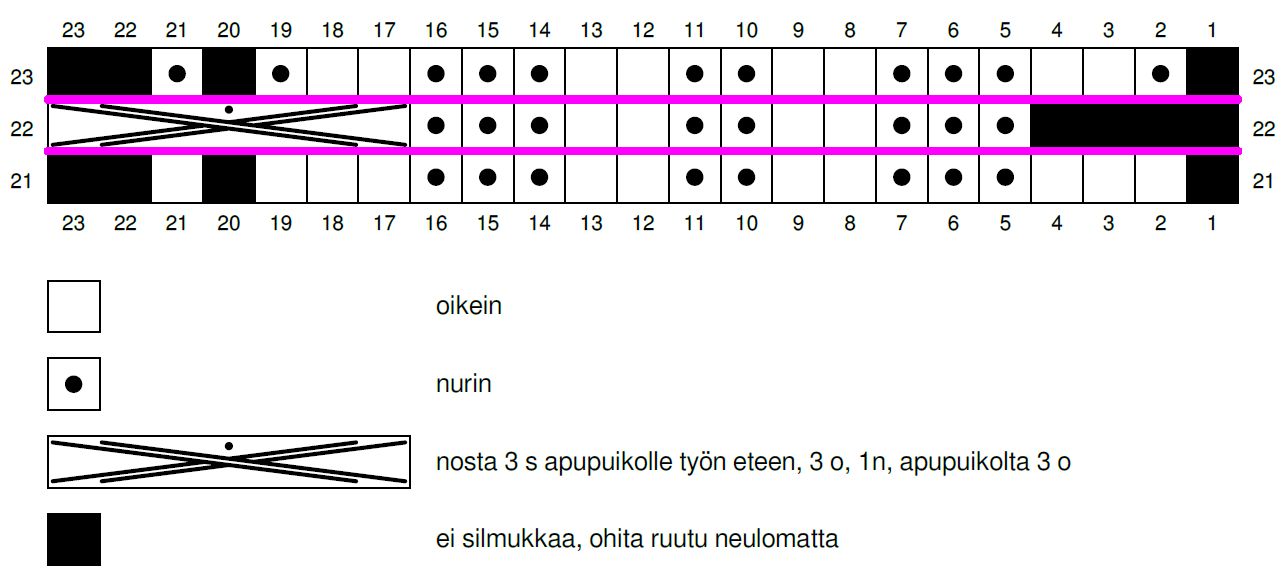 Merja Ojanperän Punottuja-puseron ohjeeseen (SK 1/24, malli 28) oli päässyt livahtamaan vanha versio kaaviosta, korjauksen virheelliselle riville 22 löydät alta.