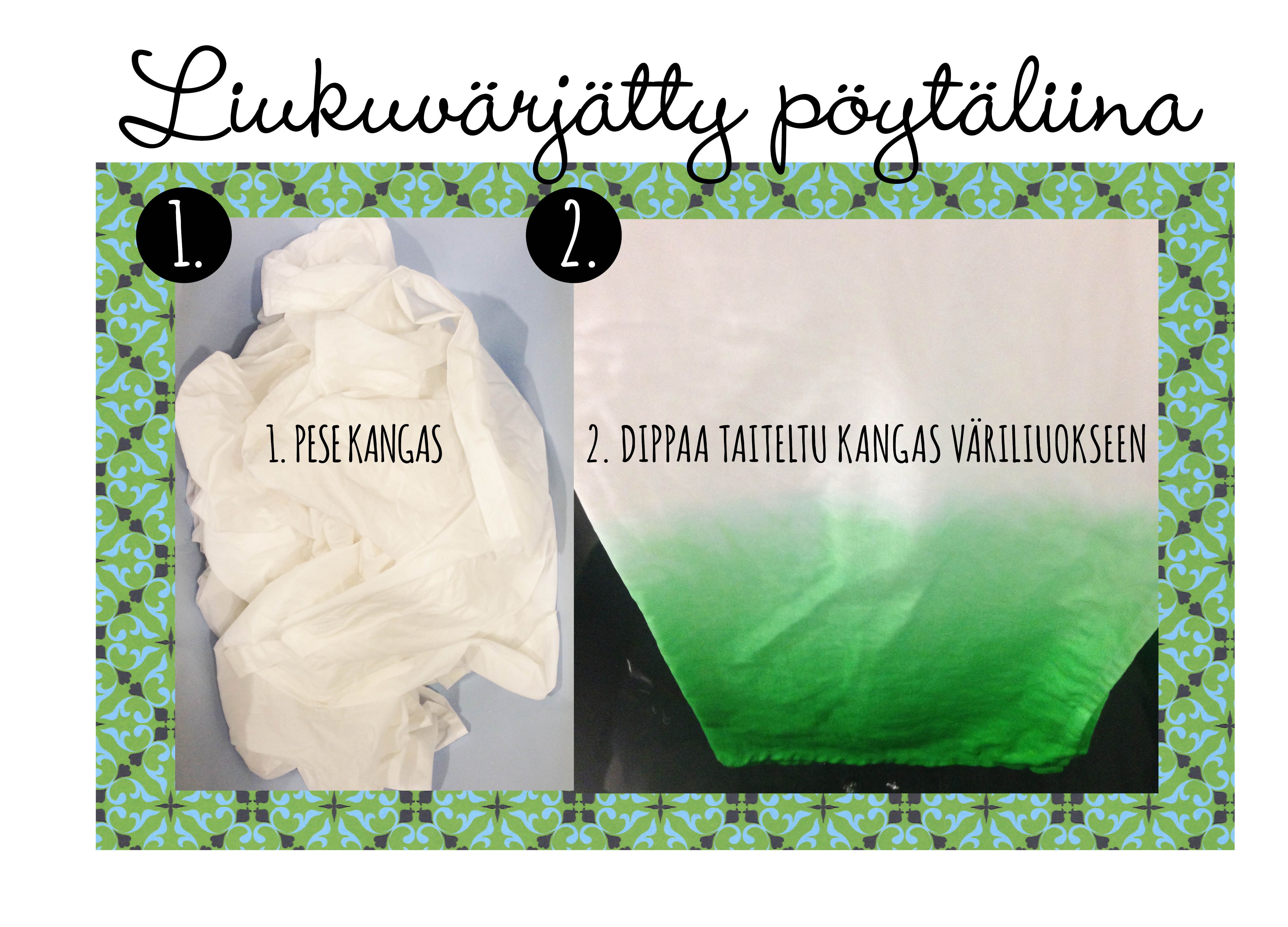 Valkoinen pöytäliina tai iso lakana saa trendikkään juhlailmeen, kun liukuvärjäät sen helmat tekstiilivärillä.