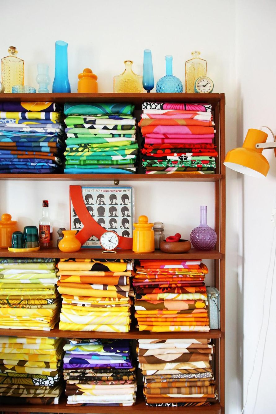Mummillani oli täydellinen 1960-luvun designkoti, jossa oli uima-allas, kuten ajan tyyliin kuului. Asuin viikot mummin luona, ja minusta oli ihanaa istua uima-altaan ääressä, saunatuvan kodikkaalla sohvalla lukemassa. Sohva oli verhoiltu tekstiilitaiteilija Marjatta Metsovaaran suunnittelemalla Joiku-kankaalla. Tunnelma jäi mieleeni positiivisena ja lämpimänä. Uskon, että se sai minut myöhemmin keräämään Metsovaaran kankaita, Sarviksen muovisia tarjottimia ja Arabian puhalluskuppeja. Ostin ensimmäisen kankaani lukiolaisena. Intensiivisempi keräily alkoi viisi vuotta sitten.