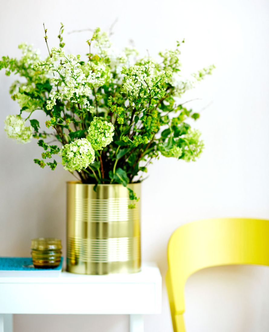Kullanvärinen kurkkupurkki, josta etiketit on liotettu pois, on nyt muodikas kukkavaasi. Hersyvässä kimpussa on sireenejä, lumipalloheisiä, jänönputkea ja rauduskoivua, <a href="http://www.rose-marie.fi/">Kukkakauppa Rose-Marie</a>. Seinälaatikko 114 B 419 e, <a href="http://www.artek.fi/fi/index.html">Artek</a>. Thonetin 107-tuoli 440 e, <a href="http://www.helenaoravadesignprojects.fi/">Helena Orava Design Project</a>.
