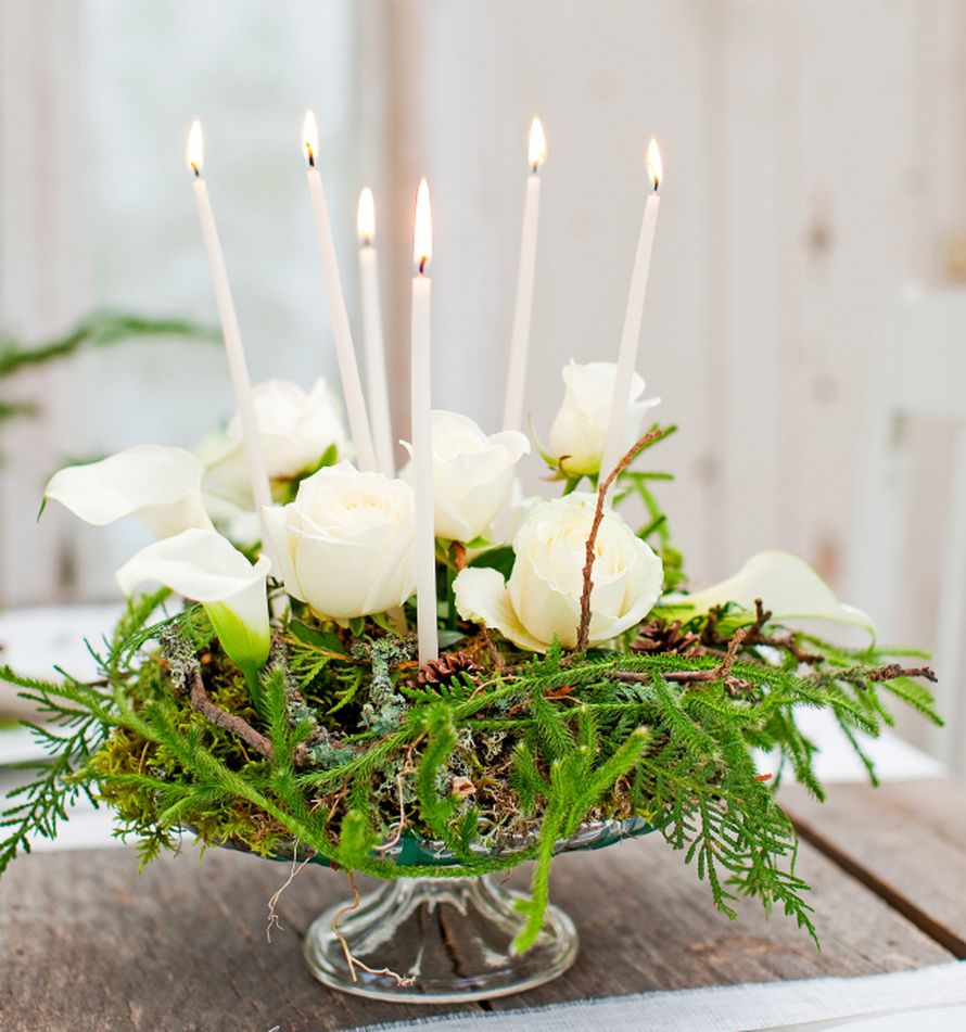 Herkät valkoiset kukat ja vihreät havut tuovat kotiin joulun tunnelmaa. Luonnollisen kauniit asetelmat on helppo tehdä itse.