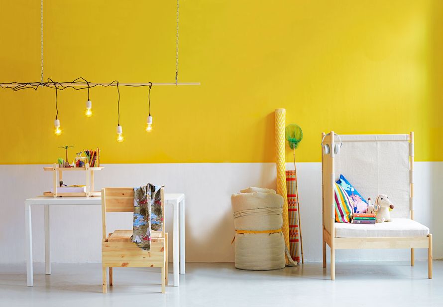 5 Maalaa seinä kahdella värillä, se tuo rytmiä huoneeseen. Superraikas väripari, valkoinen ja keltainen, piristää huoneen pimeänä vuodenaikana. Harmony-sarjan himmeä, puhtaankeltainen sävy K302 on täydellinen pimeään Suomeen, Tikkurila.