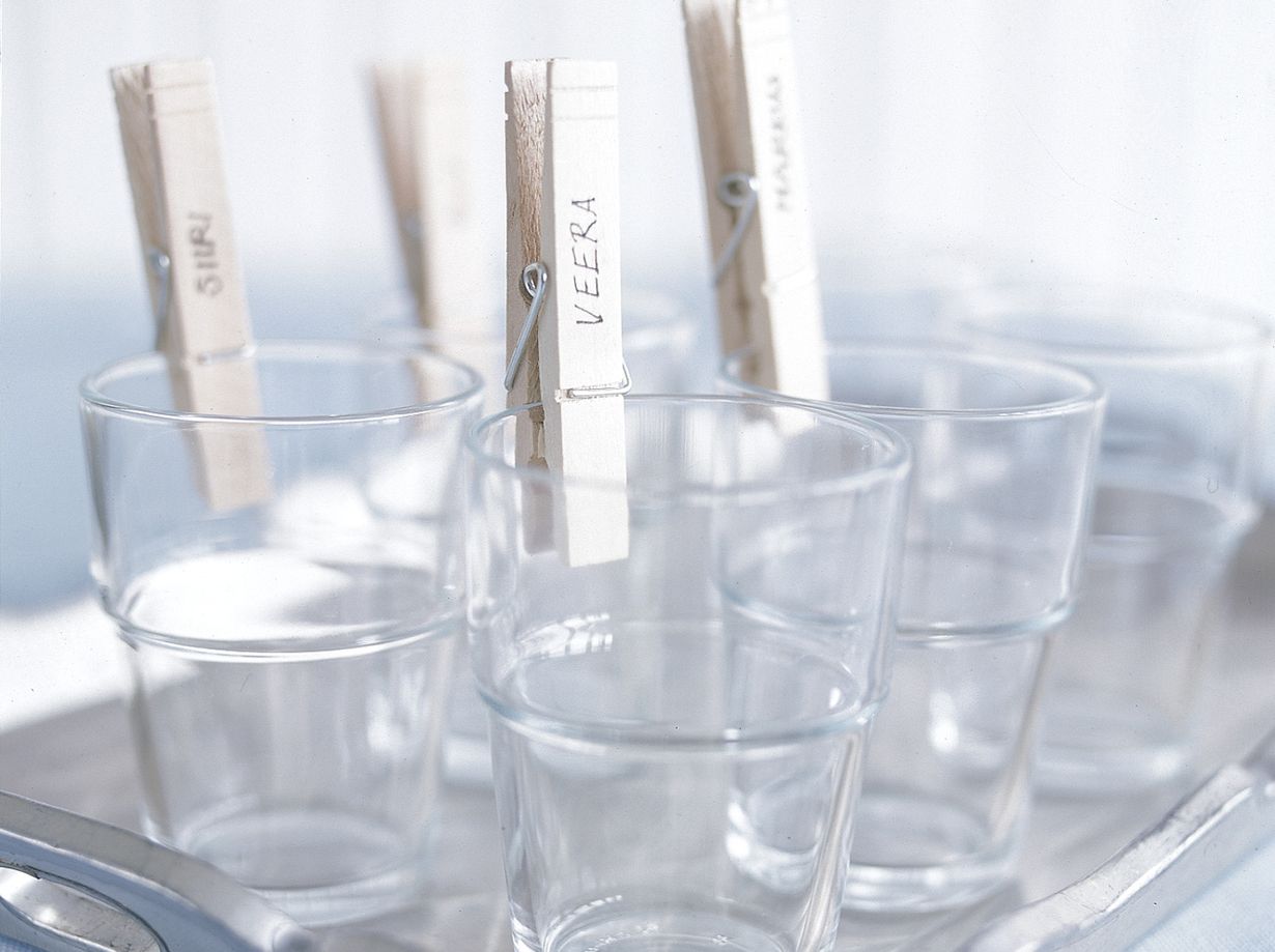 Kirjoita nimet puisiin pyykkipoikiin ja sujauta pyykkipojat laseihin heti aamulla. Tiskipöytä pysyy siistinä, eikä astianpesukonekaan täyty niin nopeasti.