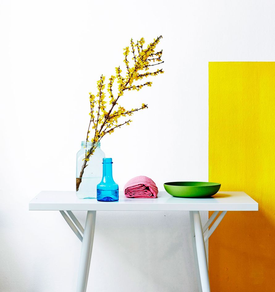 Ei tarvitse olla ammatiltaan floristi, jotta kykenee tähän näyttävään kukka-asetelmaan. Onnenpuun oksa on laitettu Riihimäen lasin korkeaan lasipurkkiin, joka on löytö Fida-kirpputorilta. Onnenpensaan oksia myy muun muassa Bauhaus, josta 2 nippua saa 5 eurolla. Wirkkala-lasipullo 179 e, Iittala. Lohenpunainen pellavapöytäliina, 140 x 250 cm, 79 e, Moko ja vihreä salaattikulho 19 e, Pentik. Ilmari Tapiovaaran suunnittelema Pirkka-pöytä 1 400 e, Artek. Kirkkaankeltainen neliö seinässä on maalattu Tikkurilan Harmonyllä, sävy K302.