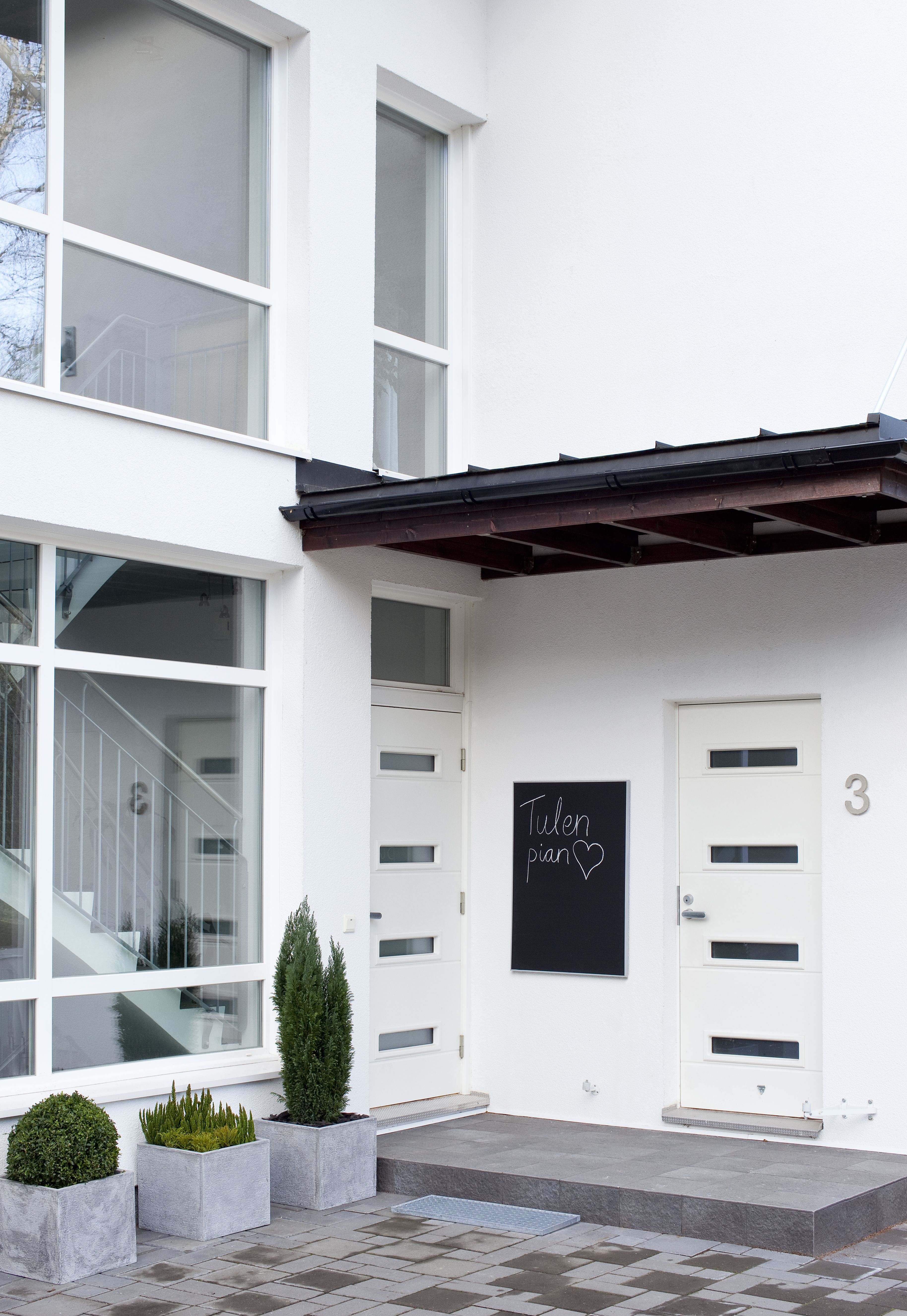 Modernin talon eteen sopivat linjakkaat ruukut ja vihreät istutukset. Betonisilta näyttäviin kuituruukkuihin istutettiin pyöreä puksipuu, matalia Hebe-lajikkeita ja korkea sypressi. Viestitaulu oven viereen syntyi maalaamalla taulupohja liitutaulumaalilla. Talon numero on valettu itse betonista.
