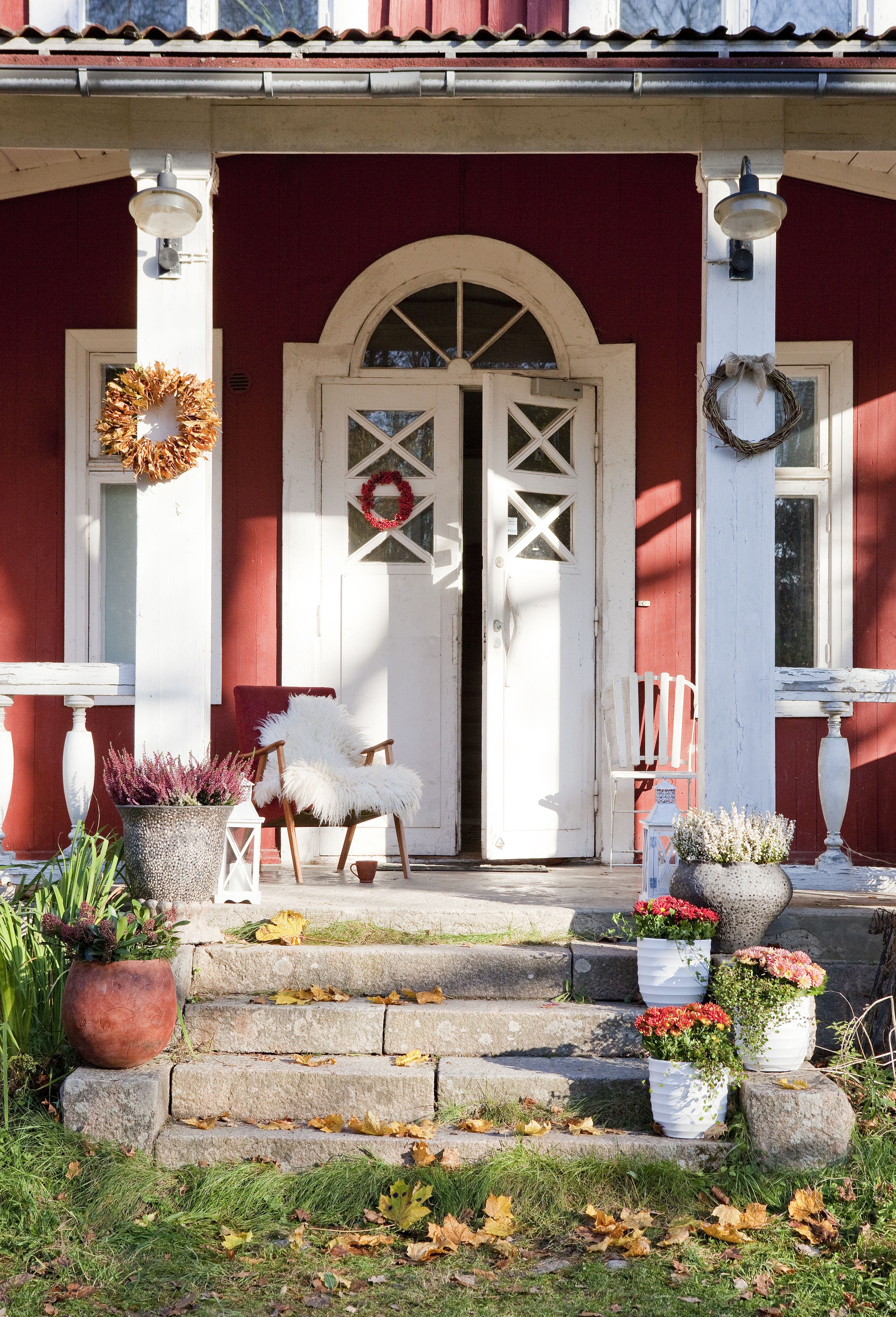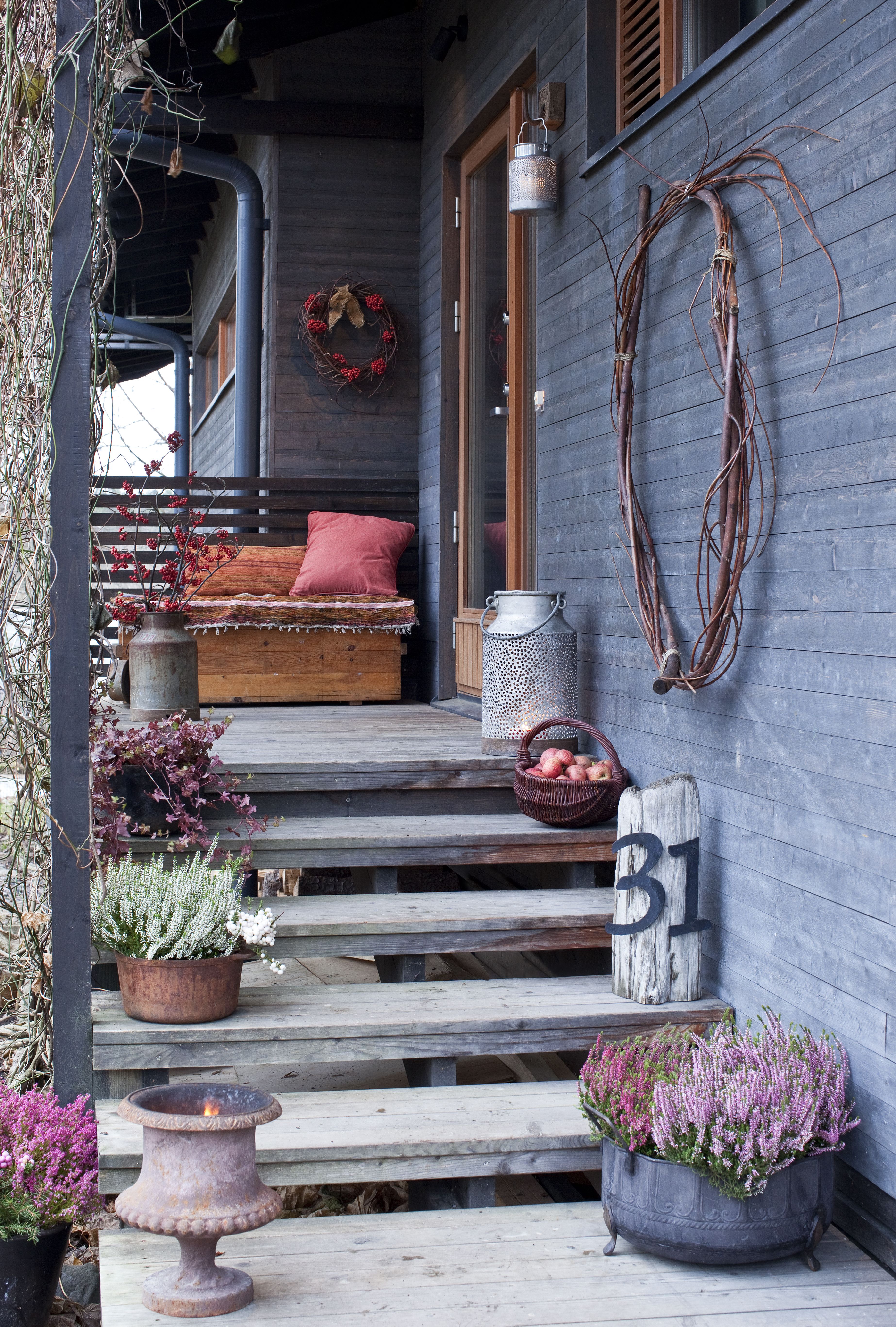 Aitokanervat ja skimmiat suurissa ruukuissa luovat kutsuvan tunnelman vanhan talon kiviportaille. Niiden lomaan tehtiin asetelma puutalon puitteiden värisistä valkoisista lyhdyistä ja ruukuista, joihin istutettiin krysanteemeja, lankaköynnöstä ja murattia. Tolpat ja ulko-ovi viimeisteltiin itse tehdyillä, helpoilla syyskransseilla.