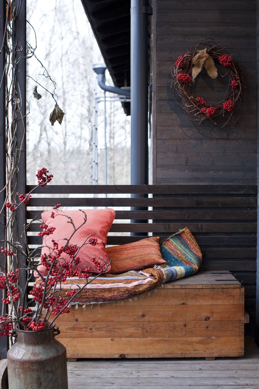 Houkuttelevan rento sisäänkäynti syntyy istuttamalla kukkia sekalaisiin vanhoihin astioihin. Ruosteinen kattila, pata ja maitotonkka pärjäävät hyvin ruukkuina. Talon numero kiinitettiin harmaantuneeseen ajopuuhun, ja ulkoroihu sai tulisijakseen rautaisen kukkaruukun. Oven viereinen penkki kätkee kätevästi puutarhatyökalut. Se pehmustettiin räsymatolla ja tyynyillä. Kranssit kieputettiin koripajusta. Syksyllä kranssin voi koristella pihlajanmarjoilla, talvella valosarjalla.