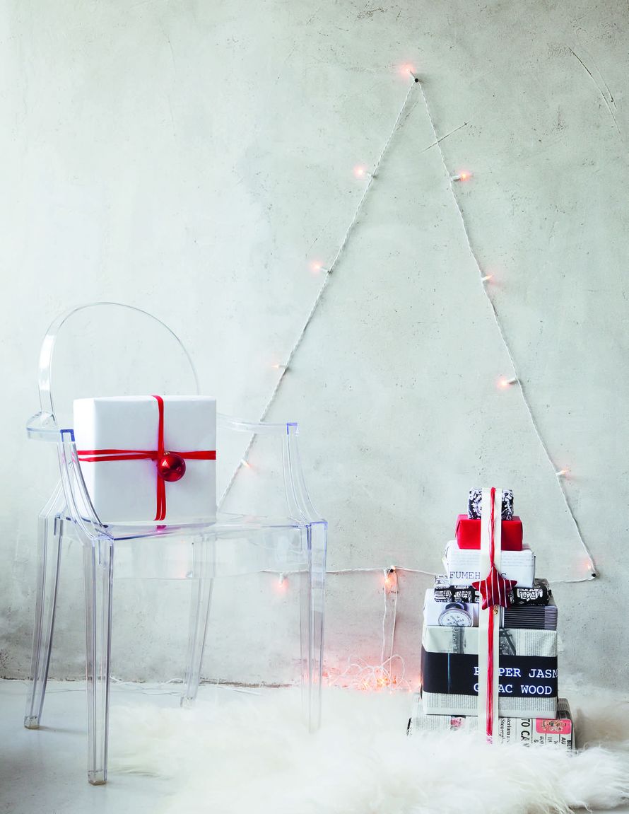 Joulukuusen ei tarvitse tukkia kokonaista olohuoneen nurkkaa. Jos arvostat hillittyä tyyliä, kuuseksi voi riittää valosarja seinällä. Naputa seinään neljä pientä naulaa ja virittele valoketju niiden varaan kuusen muotoiseksi.