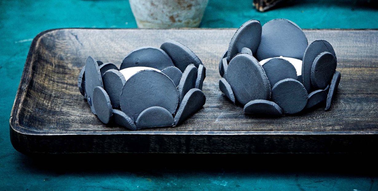 Savikiekoista syntyy helposti näyttävä tuikkulyhty pikkujoulupöydän koristeeksi.