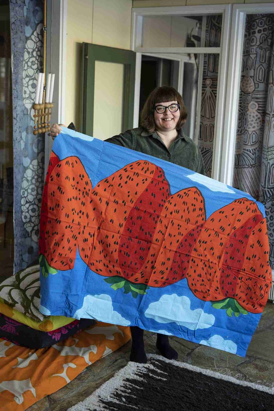 Uudemmassakin Marimekon tuotannossa on hienoja kankaita, mutta vintagekankaan tuntu on erityinen, jämäkkä ja tiivis. En tiedä, voiko väripintaa fyysisesti tuntea, mutta sielullisesti voi, niissä on henki. On käsittämätöntä, että joillekin kankaat ovat vain ikkunaverhoja. Minulle ne ovat unelmia paremmasta maailmasta.”