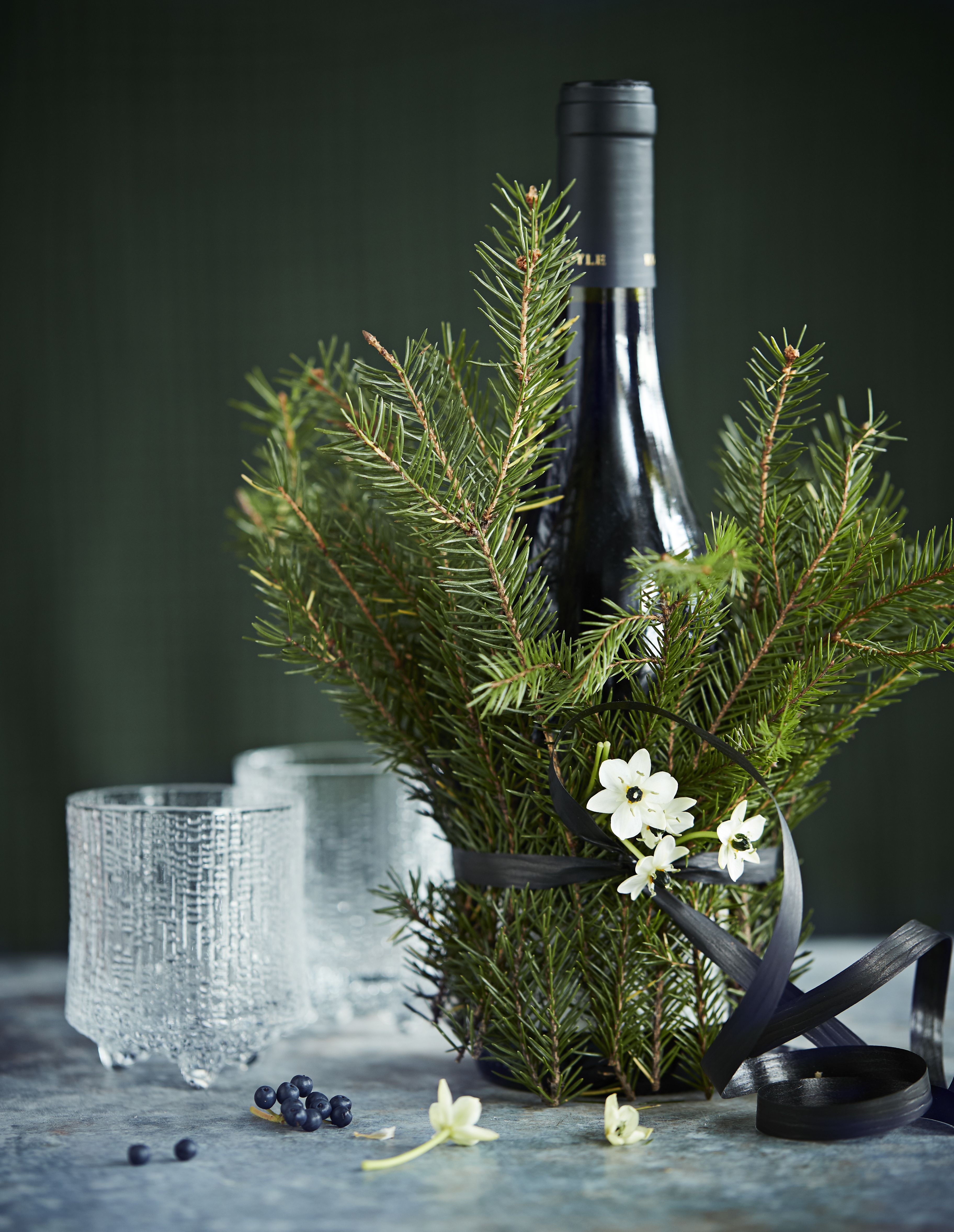 - Sujauta pulloon esimerkiksi pihakuusen oksa tai kukkakaupasta ostettu eukalyptus.