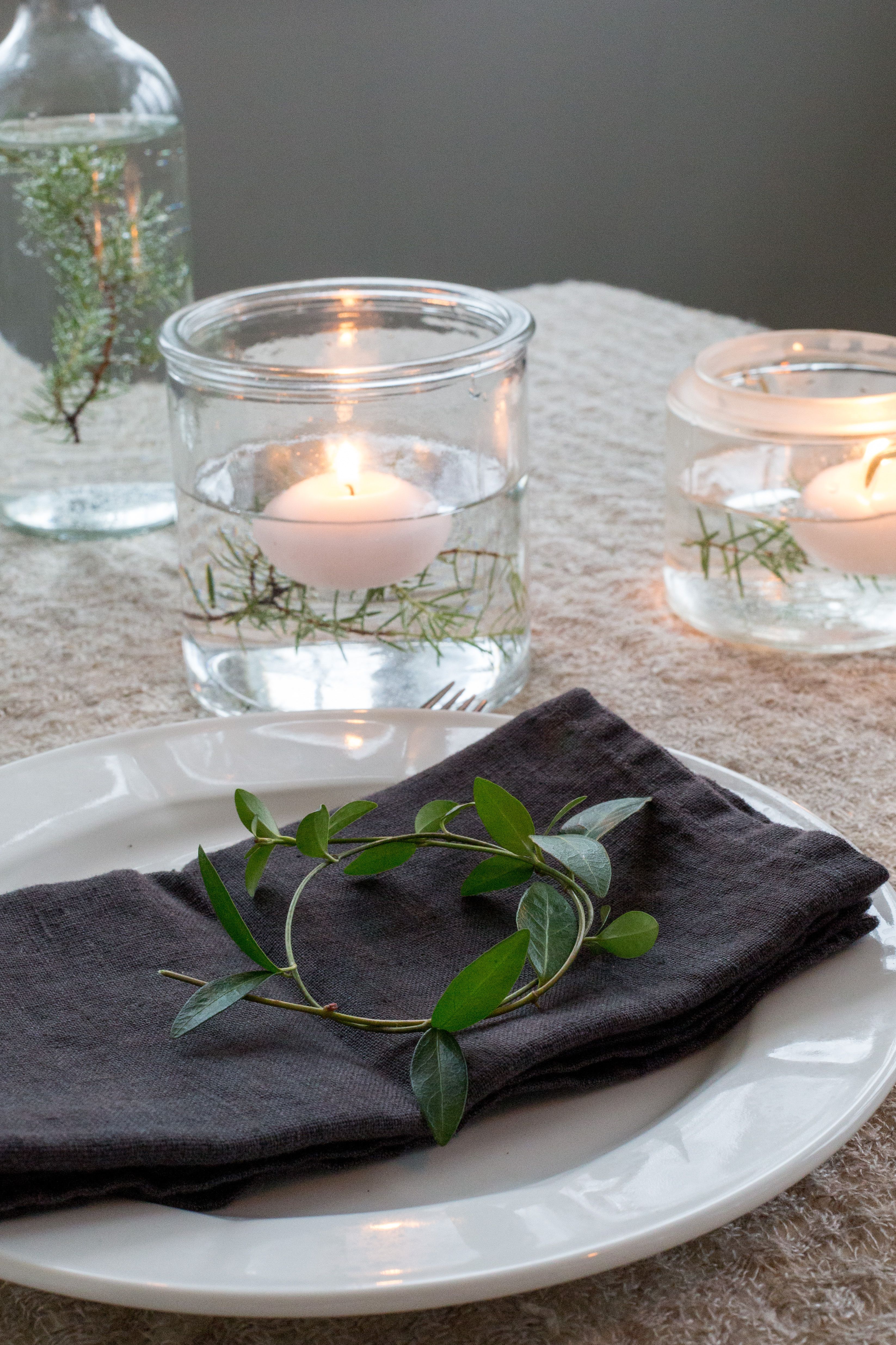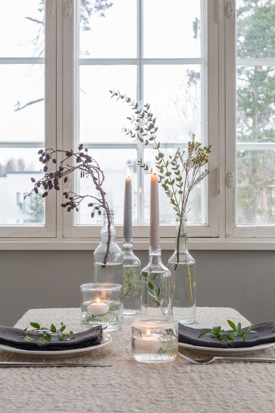 Yksinkertainen on usein kauneinta. Poimi koristeet joulupöytään omalta pihalta, metsäretkeltä tai hyötykäytä joulukuusesta karsitut oksat.