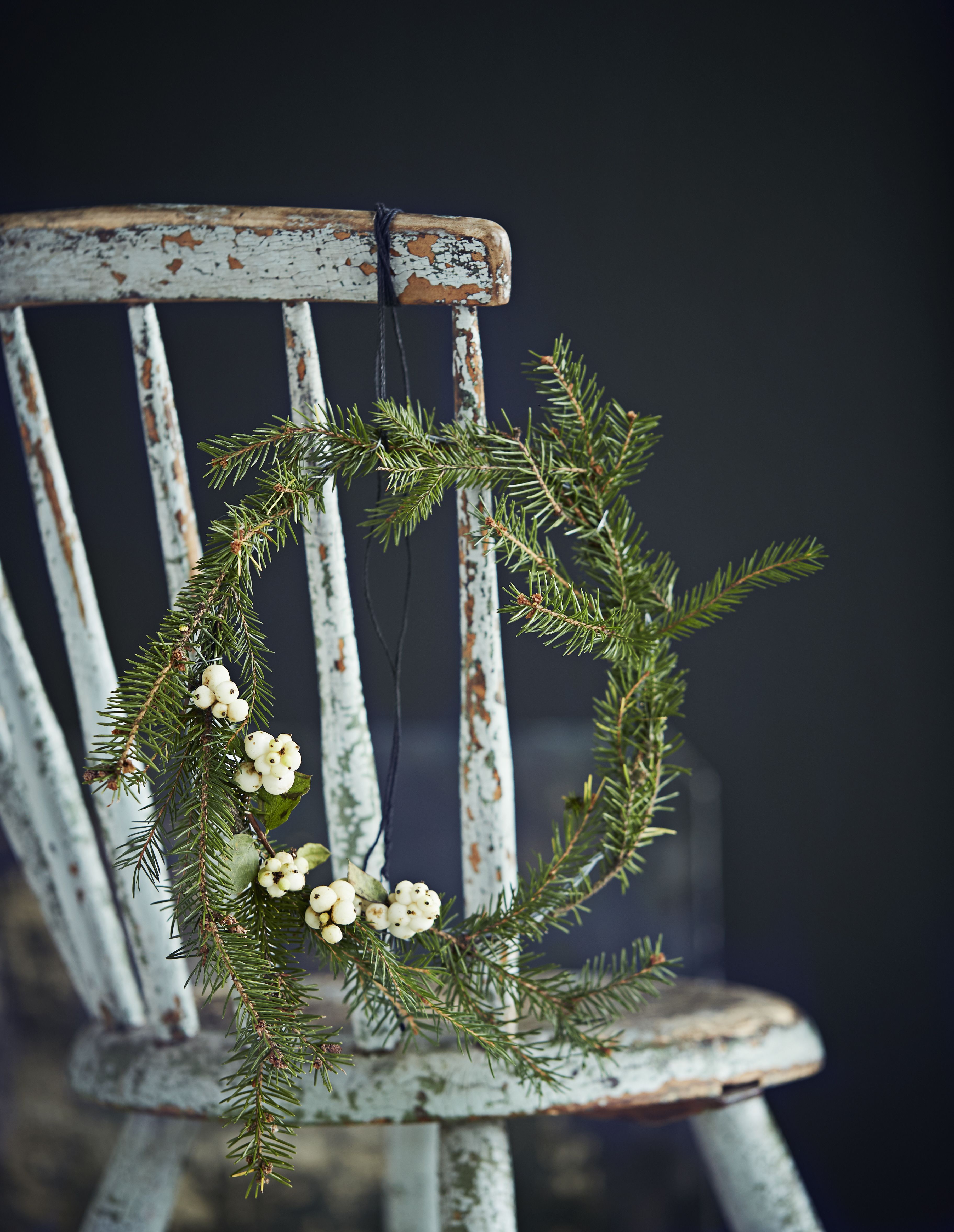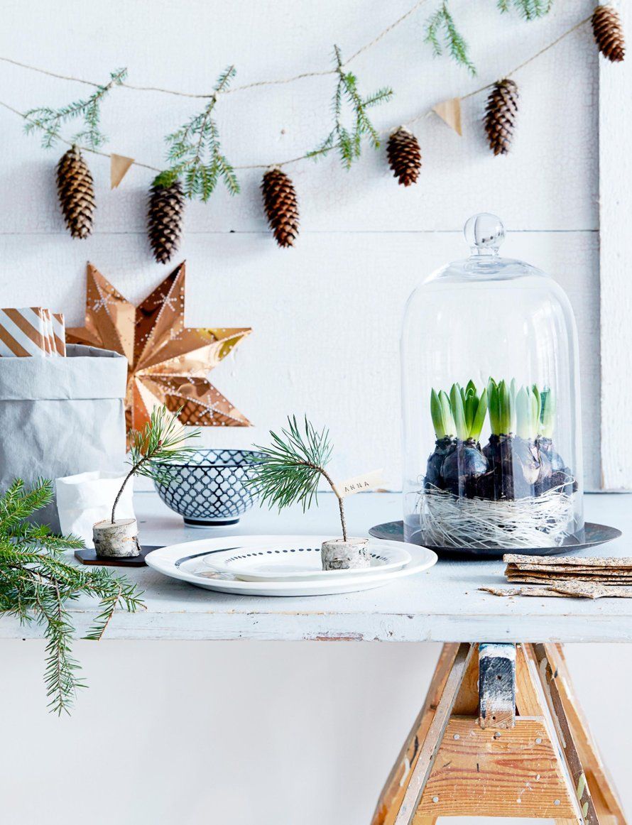 Ripusta seinälle tai pujottele pöydälle kattauksen keskelle kuusenoksista ja kävyistä sidottu köynnös.