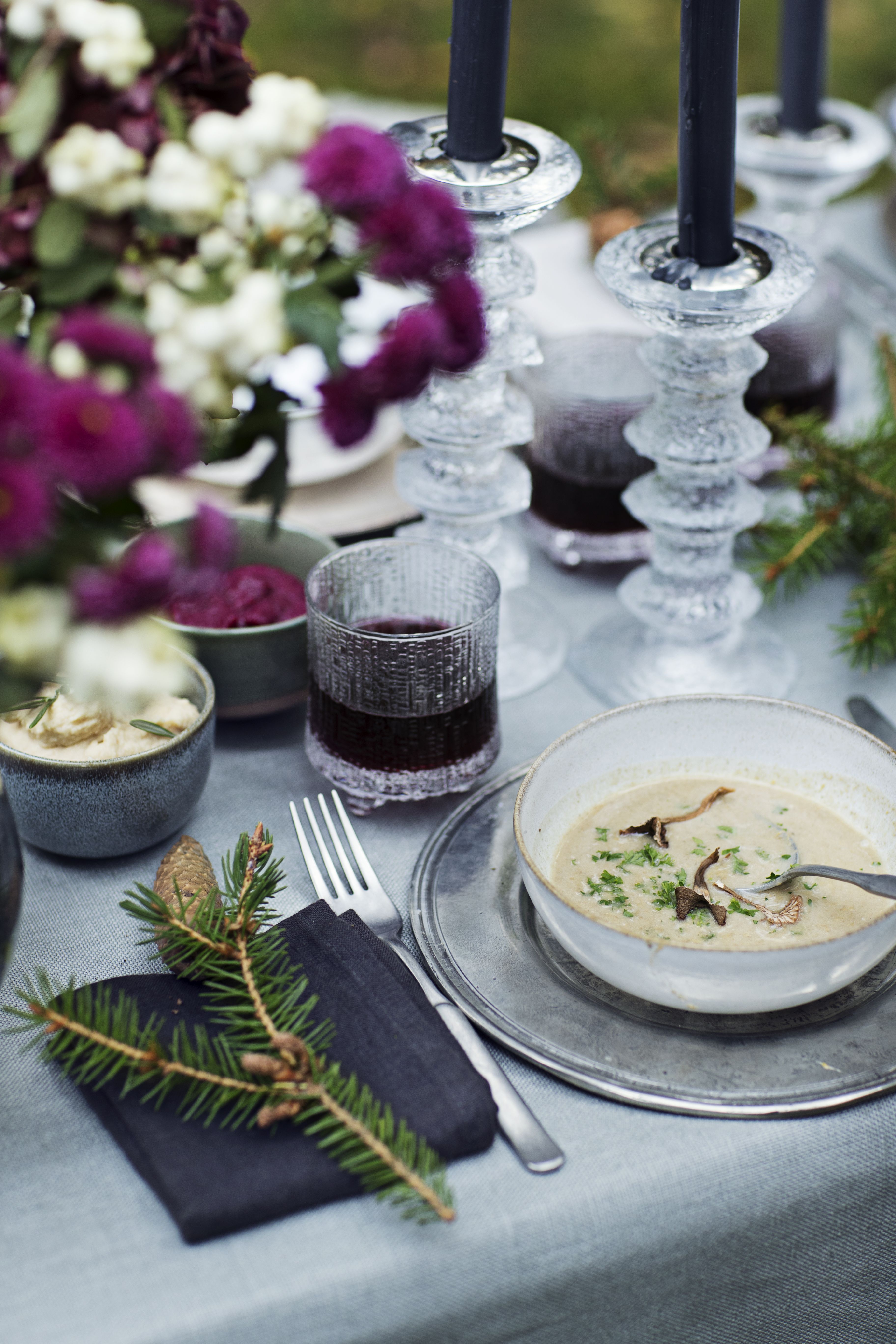 - Kattauksessa saa olla rosoa. Ryppyjä ei tarvitse silittää eikä kolhuja peittää. Havuntuoksuinen kattaus rakennetaan pienin elein. Hyasintti-istutuksessa juuret saavat jäädä näkyviin. Ne ovat juuri sopivan krouvit tähän kattaukseen. Kuparin hohto tuo juhlan tuntua.