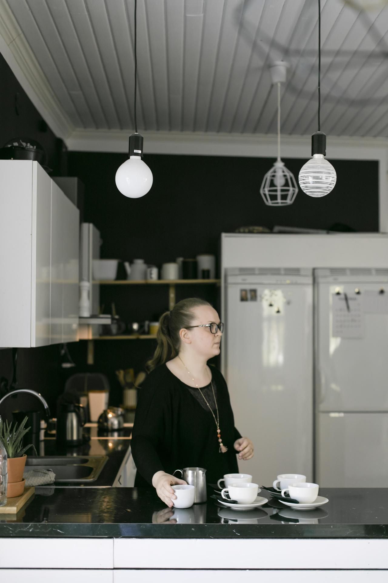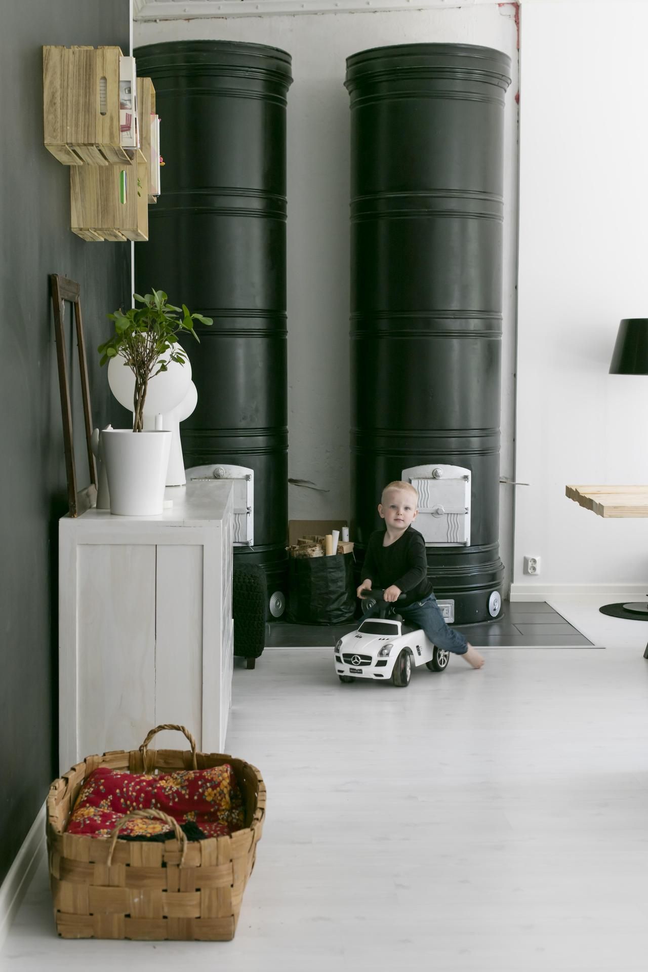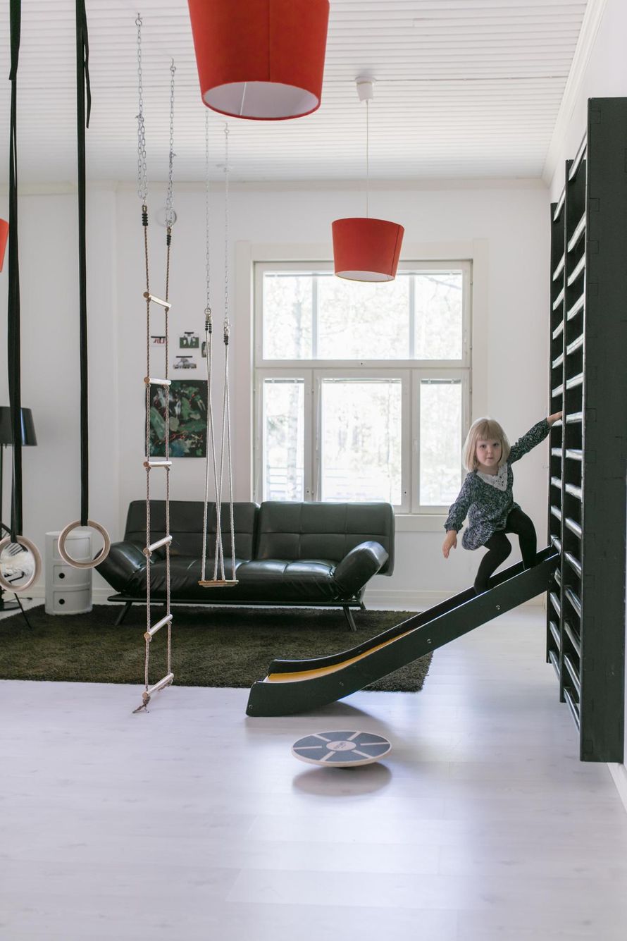 Värimaailma on yhtenäinen: musta ja valkoinen toistuvat joka huoneessa, ja lastenhuoneissa on iloisia perusvärejä.