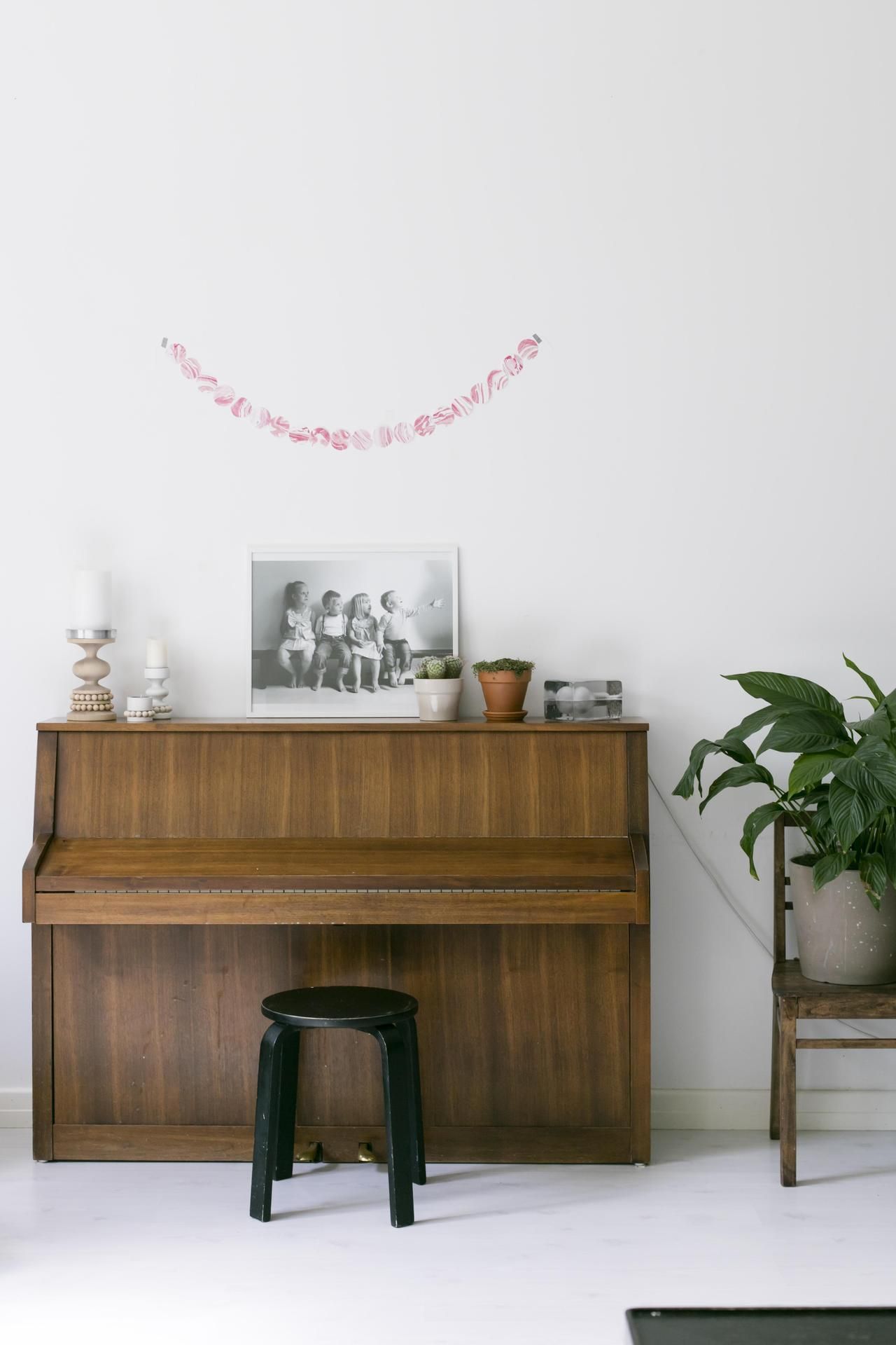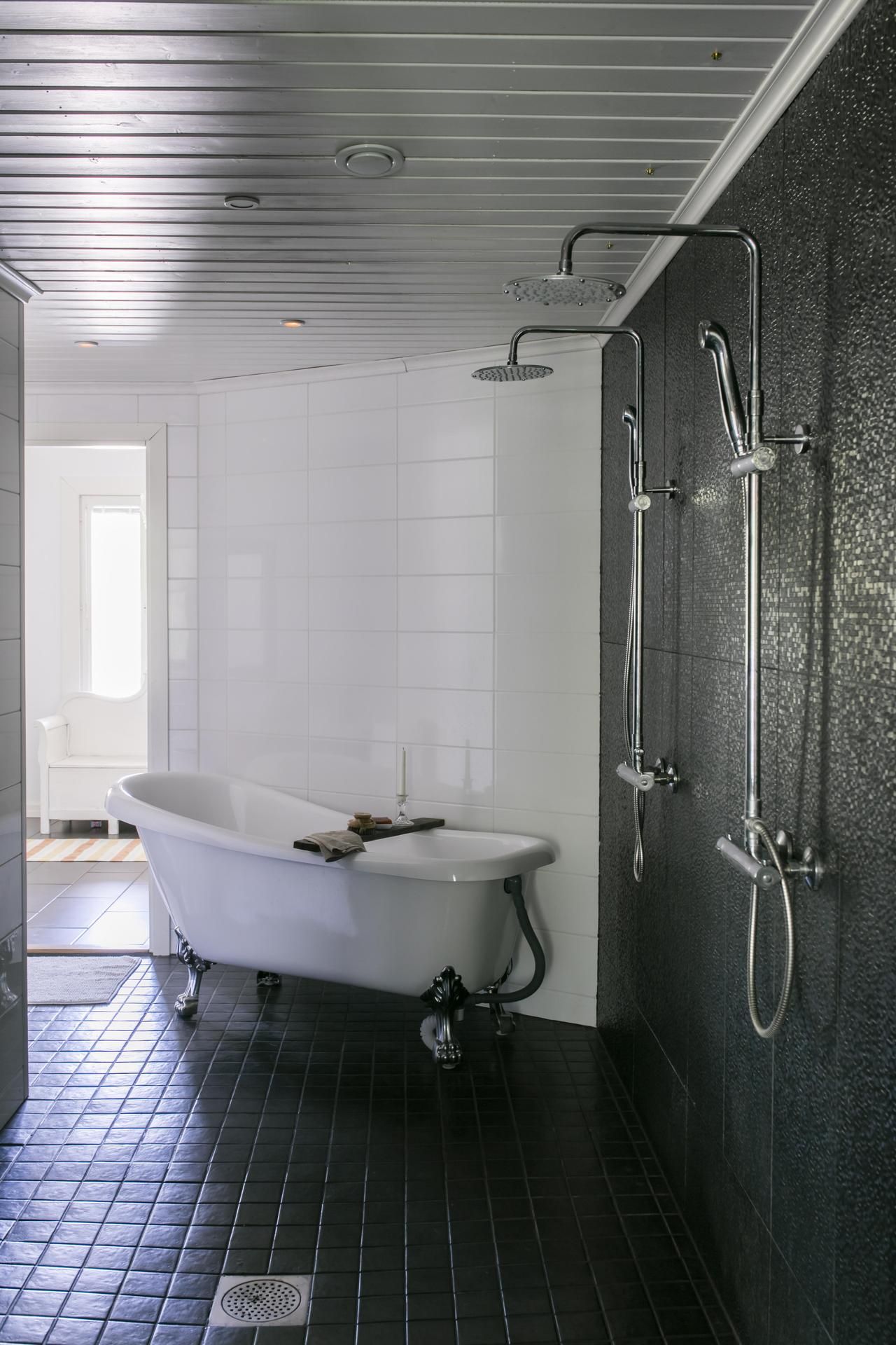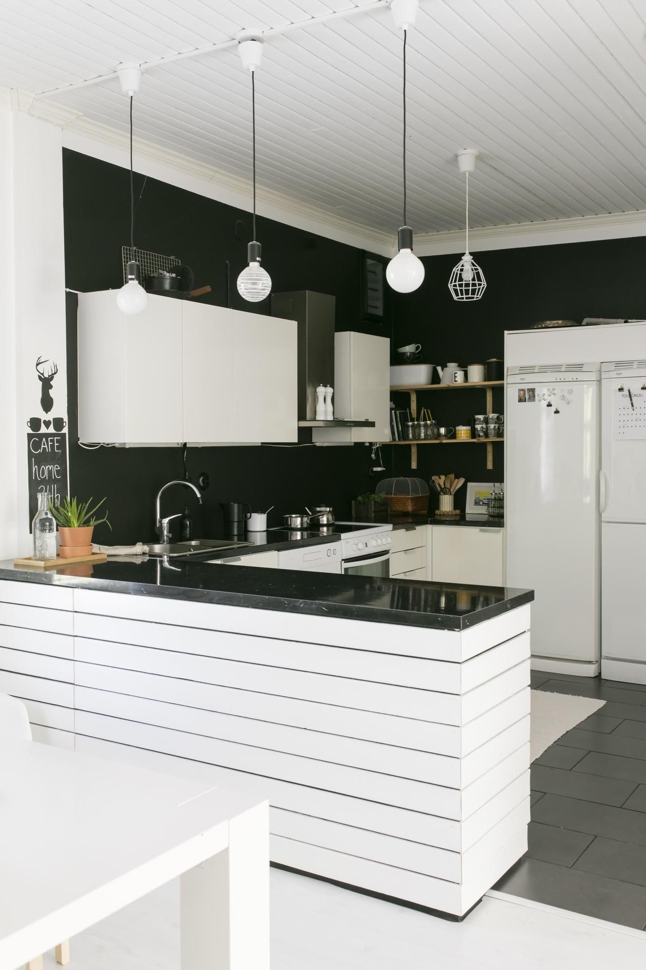 Värimaailma on yhtenäinen: musta ja valkoinen toistuvat joka huoneessa, ja lastenhuoneissa on iloisia perusvärejä.