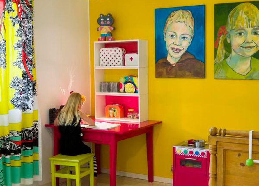 Lotta, Teemu ja Siiri Vuorman koti on tehty vahvoista väreistä. Katso kuvat kodin ihanan energisoivista seinistä!