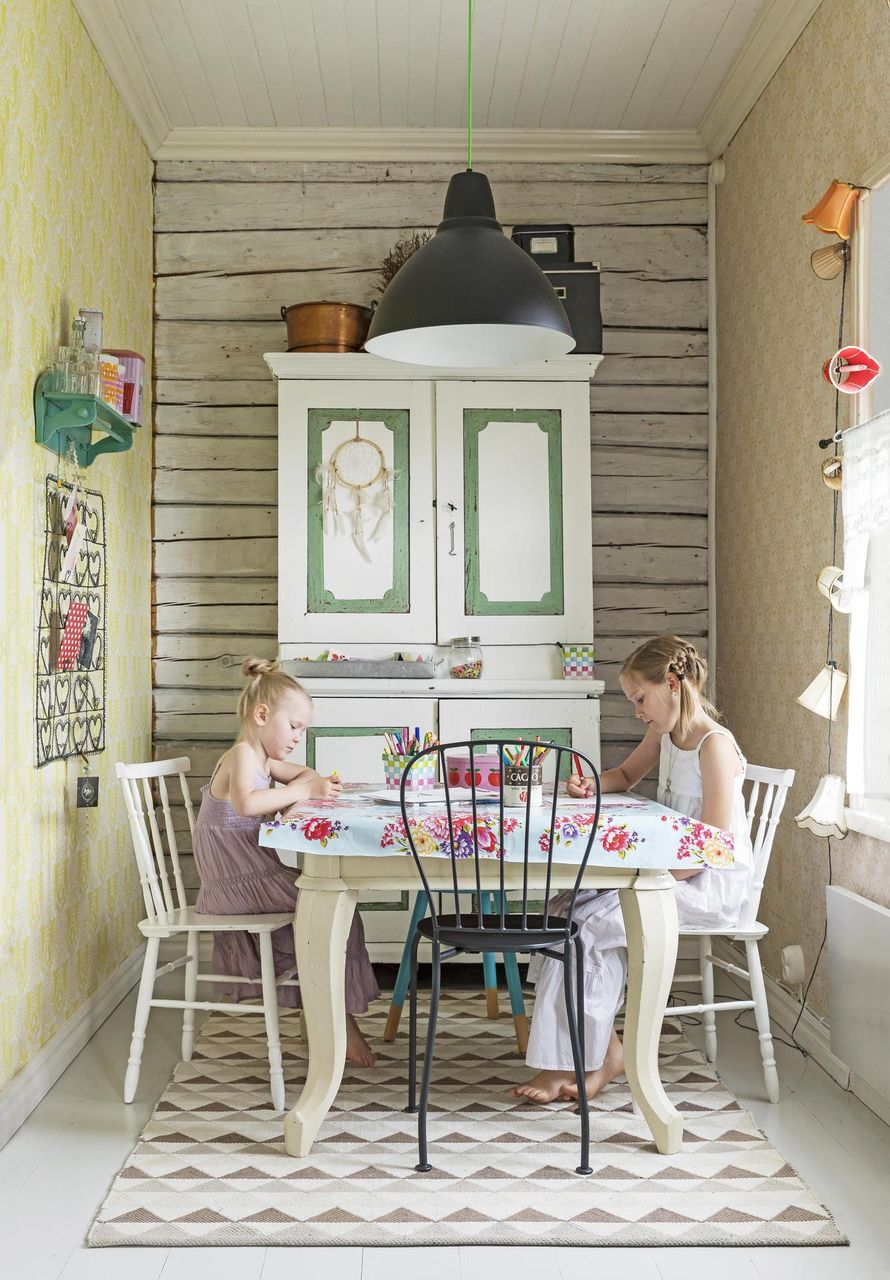 Huldan ja Thelman piirtelyhetki autiotalosta pelastetun pöydän ääressä. Kaappi, jossa säilytetään askartelutarvikkeita, on kirpputorilöytö.