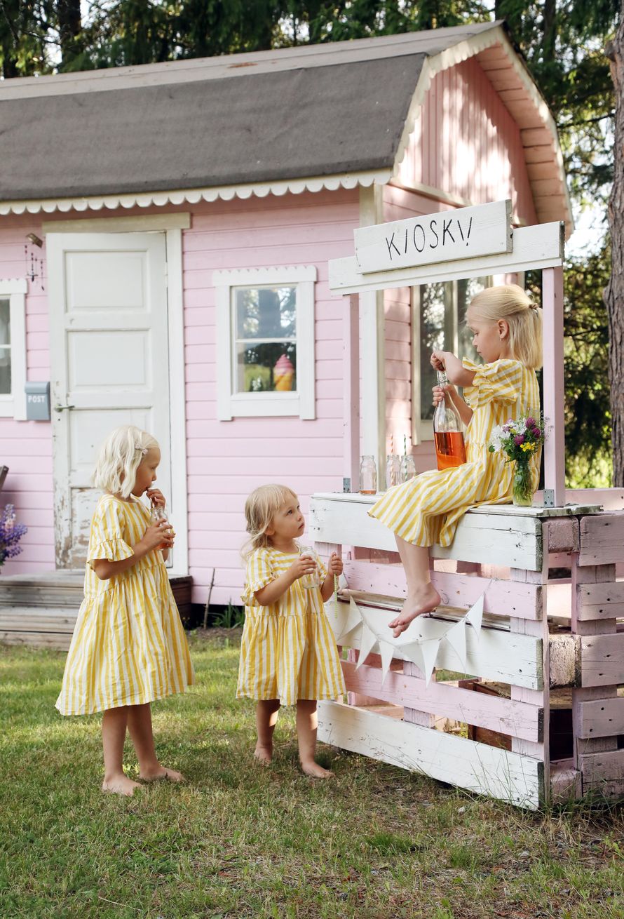Kun mökin odotus tuntui Pepin ja Myyn mielestä pitkältä, Heidi rakensi ensihätään kuormalavoista hauskan kioskin sävy sävyyn. Aliisa oli silloin vielä vauva.