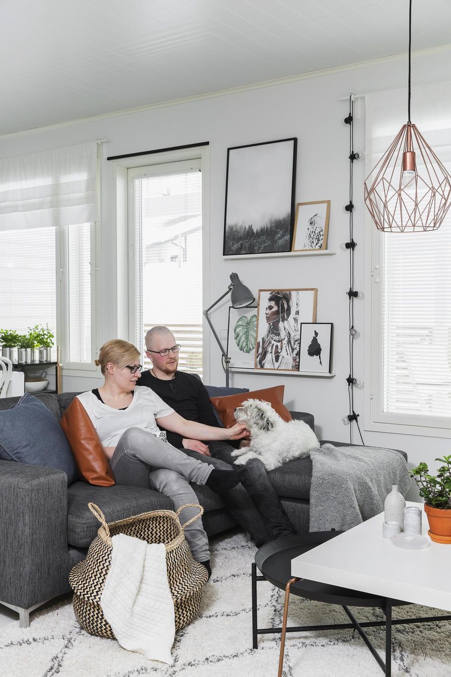 Koska talo oli ostovaiheessa vasta rakenteilla, pariskunta ehti valita pintamateriaalit itse. Kodinhoitohuoneeseen, eteiseen ja kylpyhuoneeseen laitettiin tummat laattalattiat, sillä niissä ei näy kura helposti.