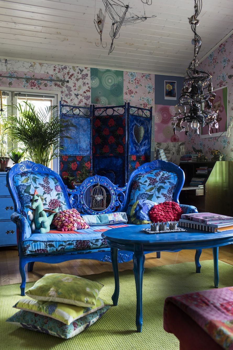 Villit värit ja kukkakuosit valloittivat Marjo ja Jani Hämäläisen omakotitalon lattiasta kattoon.