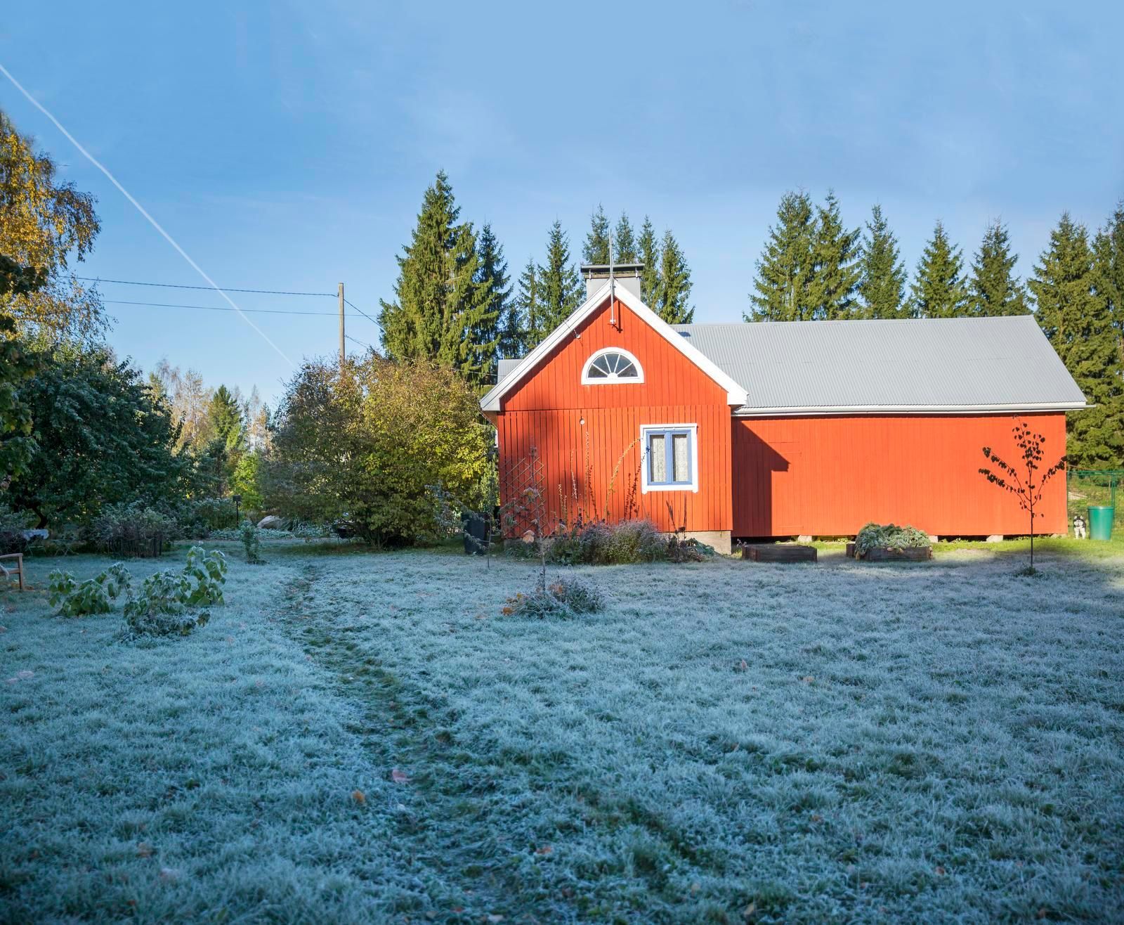 Syksyinen luonto on aurinkoisena pakkasaamuna satumainen. Pienen punaisen talon puutarhassa leijuu usva.