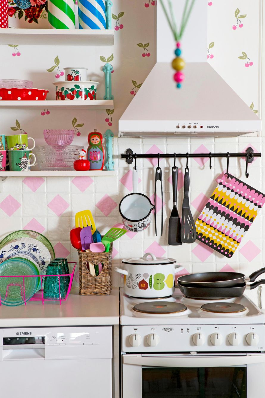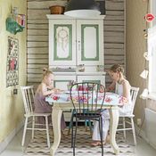 Heini: ”Sisällä ovat puhaltaneet muutoksen tuulet. Pidän raikkaista maaleista ja värikkäistä tapeteista ja vaihdan tapetteja hetken mielijohteesta. Meistä molemmista on kehittynyt kovia vanhojen aarteiden bongaajia. Kunnostamme kirpputoreilta, netistä ja antiikkiliikkeistä hankitut huonekalut yhdessä.