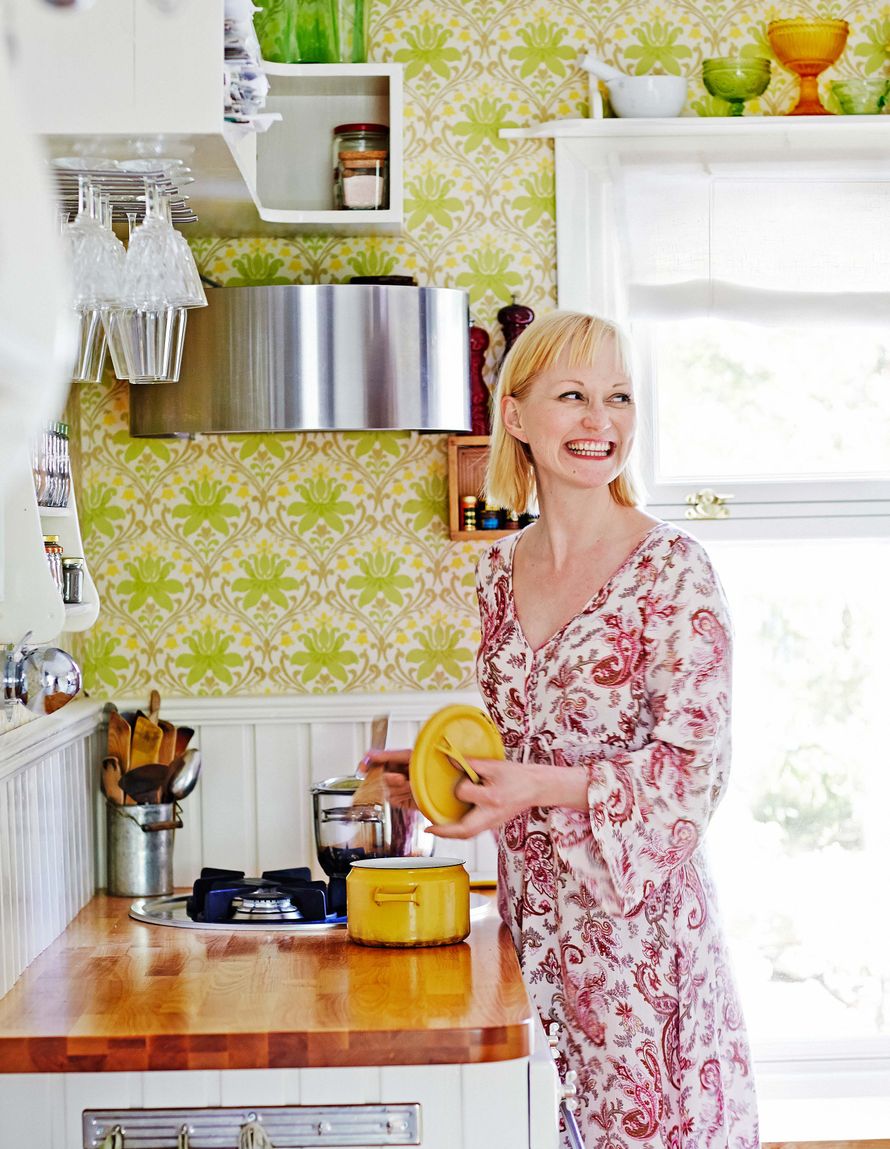 Keittiön tapetti on kotimaisen Pihlgren ja Ritolan Jugend-Magnolia.