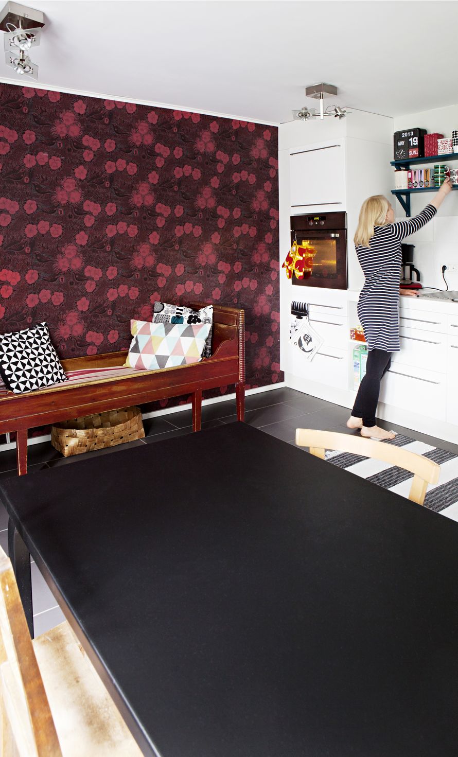 Lapsiperheen arkeen ovat parin vuoden ajan kuuluneet maalaus- ja tapetointityöt. Kotia on kunnostettu pikku hiljaa joka puolelta – vain keittiö on säilynyt tapetteineen entisellään.