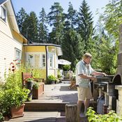 Suuri tammi, vanhat omenapuut ja sireenit varjostavat pihaa sopivasti. Sen perälle Heidi ja Marko rakensivat pienen kasvihuoneen, jonka suojissa kasvaa ainakin suippopaprikaa ja chiliä.