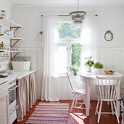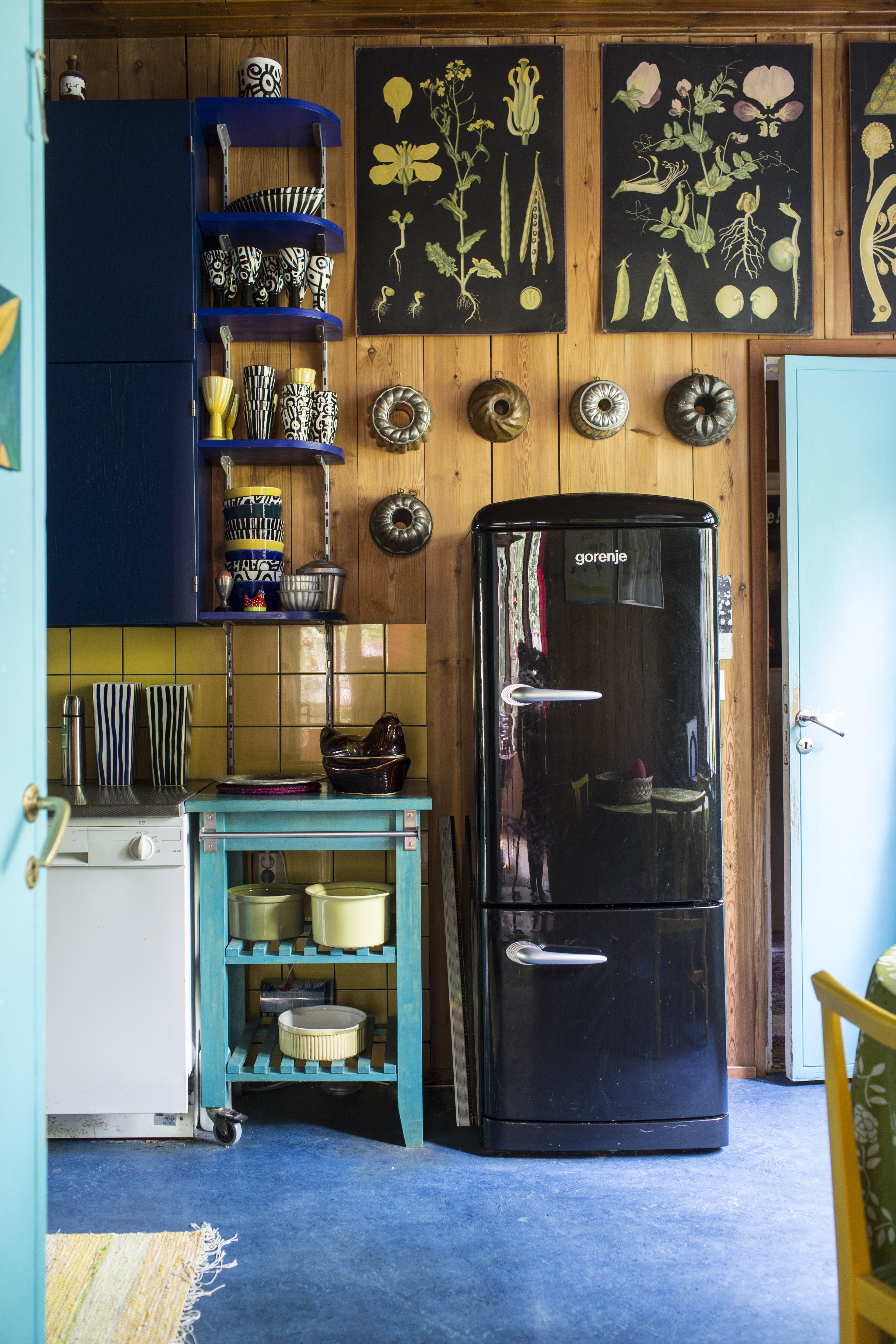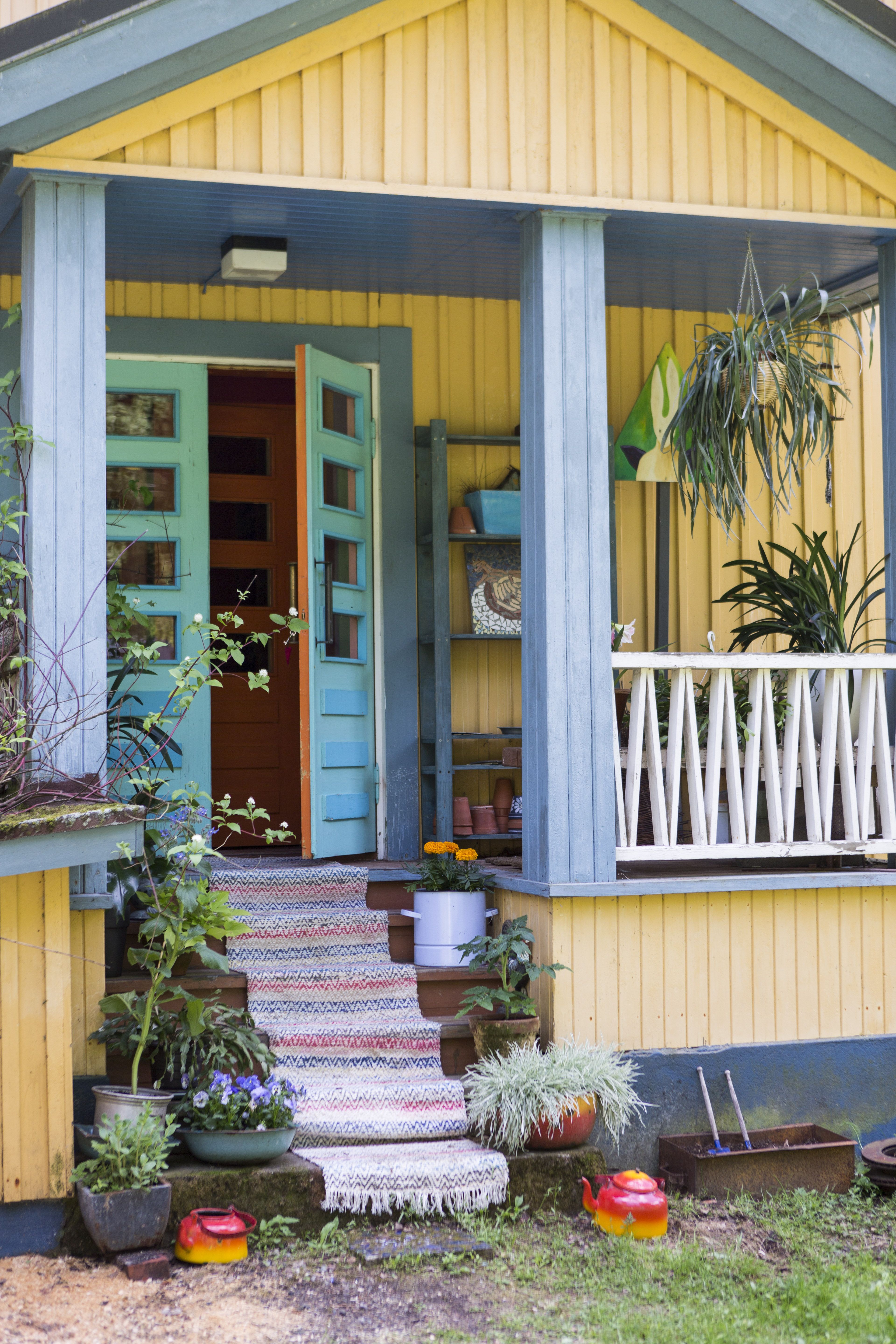 Salista avautuvat punainen, turkoosi ja keltainen ovi entiseen opettajan asuntoon. Turkoosin oven takana on keittiö, johon valo siivilöityy puutarhasta läpi ikkunaan asennettujen batiikkisydänten.