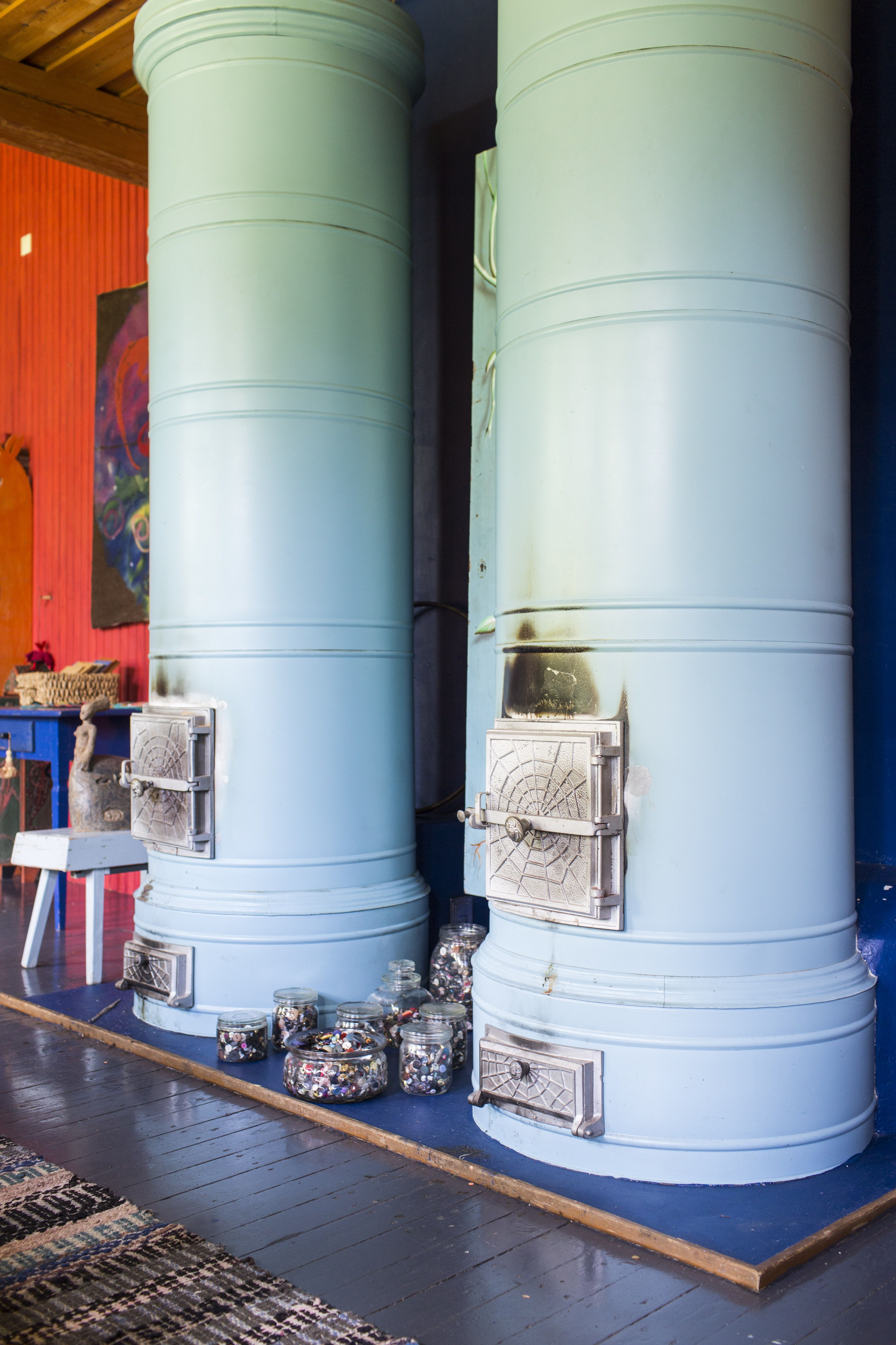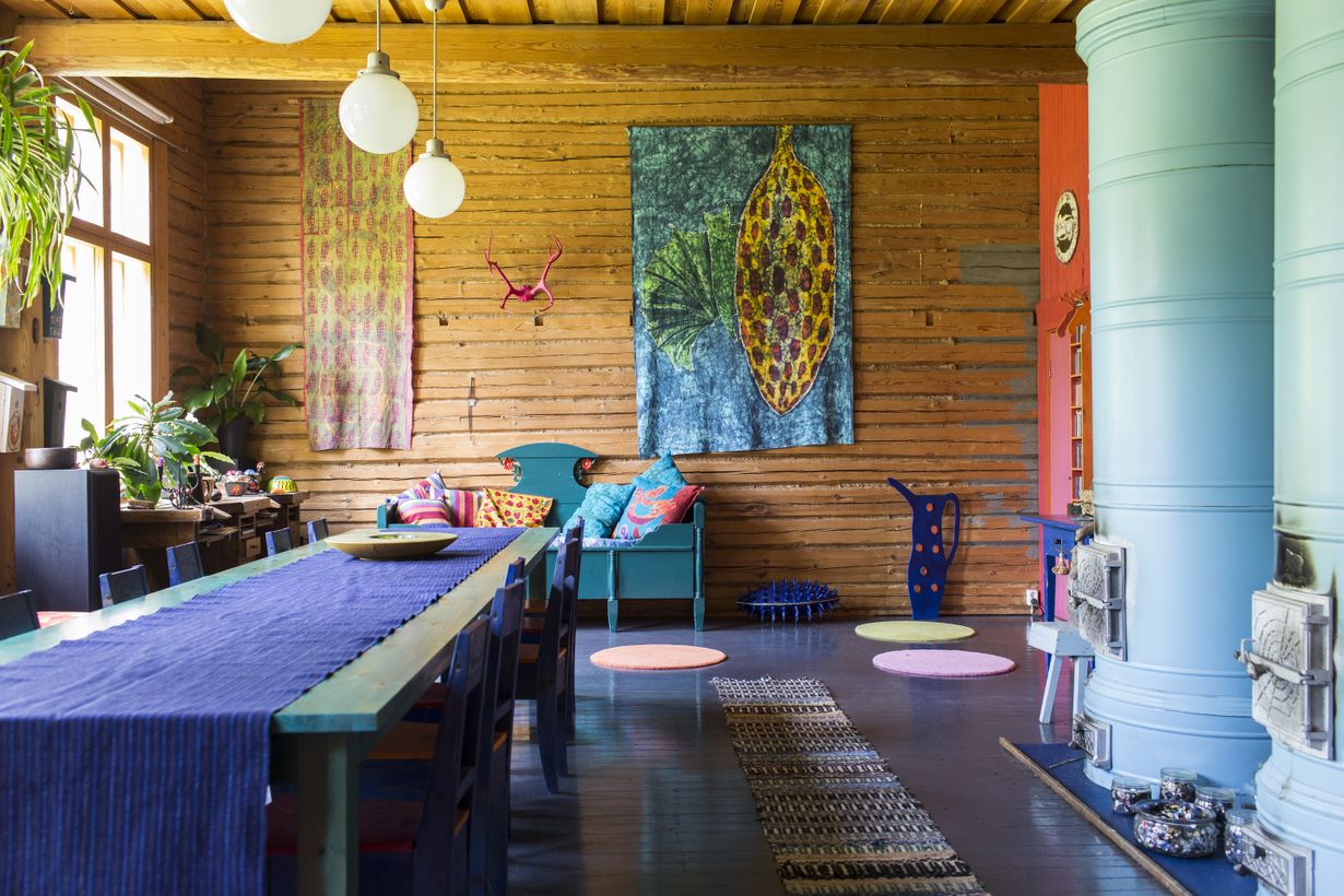 Salissa, entisessä luokkahuoneessa, kohoavat nyt taivaansiniset pönttöuunit. Liuskekiviuuni sai lähtökomennon niiden tieltä. Sirpan omat batiikkityöt värittävät seiniä, ja matkalaukkukokoelman päällä on vintiltä löytynyt lehmän kallo. Lasipurkit ovat täynnä tuhansia nappeja.