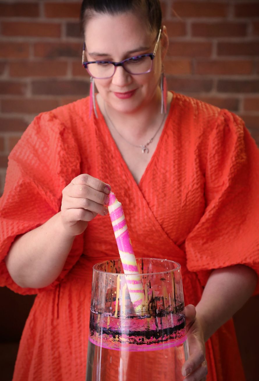 ”Kynttilöiden dippaaminen on terapeuttista. Rakastan väreillä pelaamista, niiden yhdistelyä ja kokeilemista. Lopputulos riippuu aina sekoitussuhteesta ja dippausten määrästä. Värivariantteja on helposti yli sata.