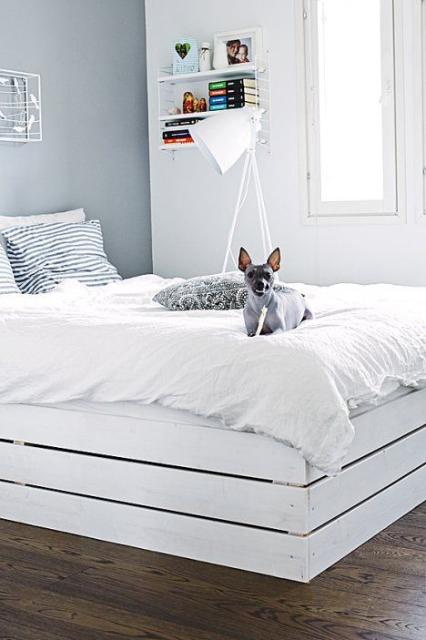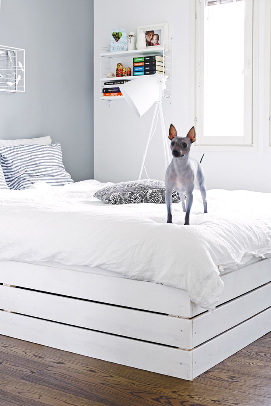 Pariskunta ei löytänyt kaupoista sopivailmeistä sänkyä, joten nikkaroitiinpa itse. Saatiin sopivan huolettoman näköinen, passelisti karkeailmeinen lautasänky. Ota tästä ohjeet helppotekoiseen petiin.